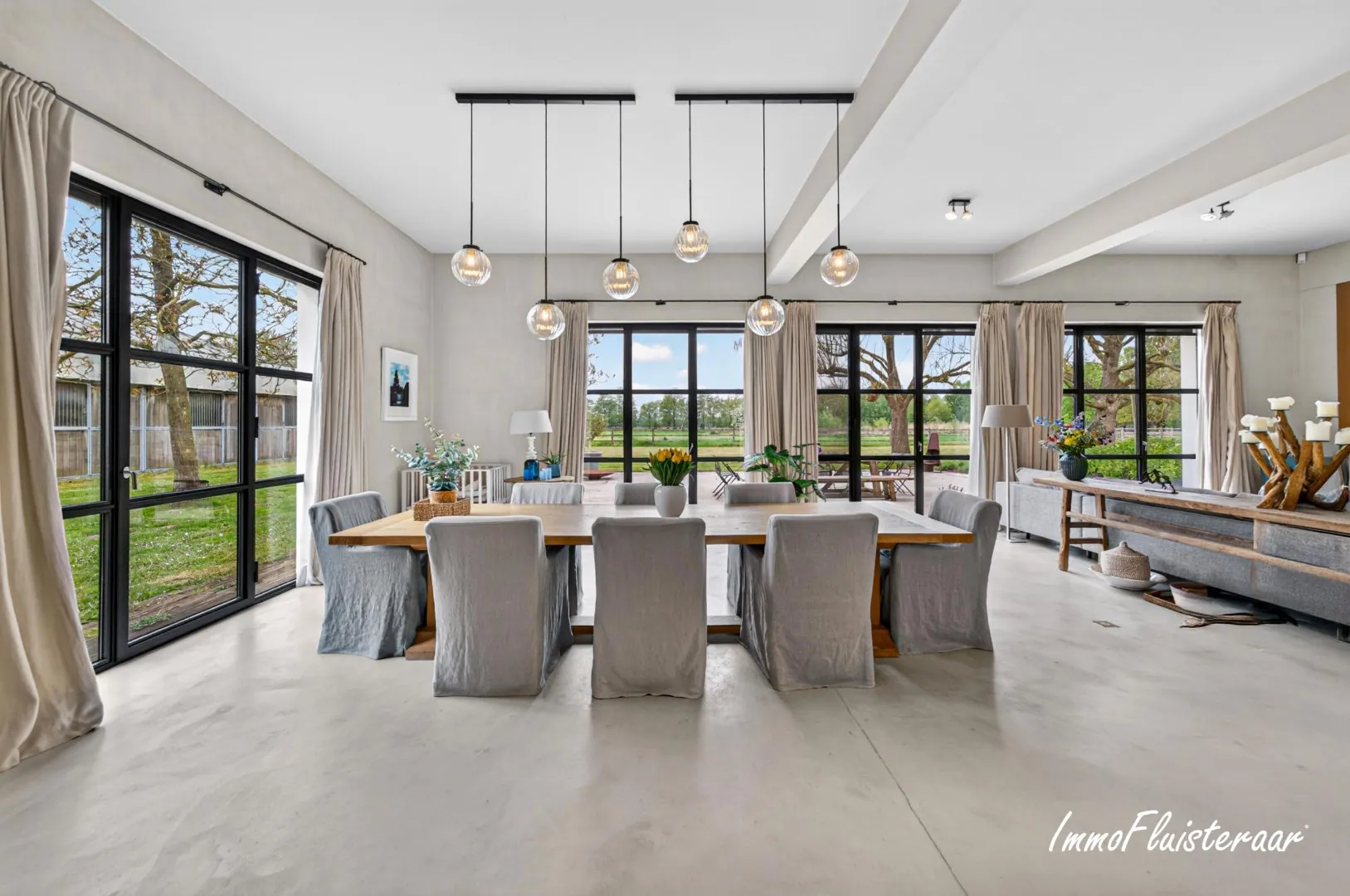 De woning straalt klasse en warmte uit, met ruime en lichtrijke leefruimtes, hoge plafonds en grote raampartijen die uitkijken op het terras en de omliggende velden. De villa beschikt over twee gezellige leefruimtes met open haard, een volledig uitgeruste keuken met eiland, een bureau en een polyvalente ruimte die perfect kan dienen als extra woongelegenheid of praktijkruimte.