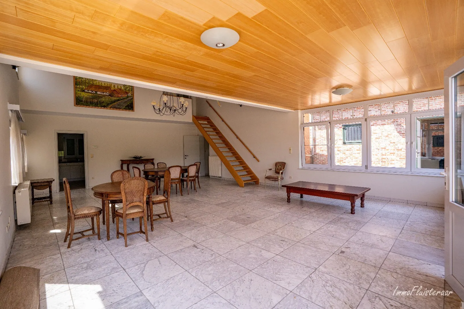 De hoeve combineert authentieke charme met praktische leefbaarheid en beschikt over een doordachte indeling. Bij binnenkomst betreed je een ruime inkomhal die leidt naar de royale, open leefruimte met grote raampartijen. Deze zorgen voor een overvloed aan natuurlijk licht en een panoramisch zicht op het omliggende groen. Aansluitend bevindt zich de keuken. Verder is er een handige wasplaats met lavabo, twee badkamers met douche en drie slaapkamers, elk met hun eigen karakter.