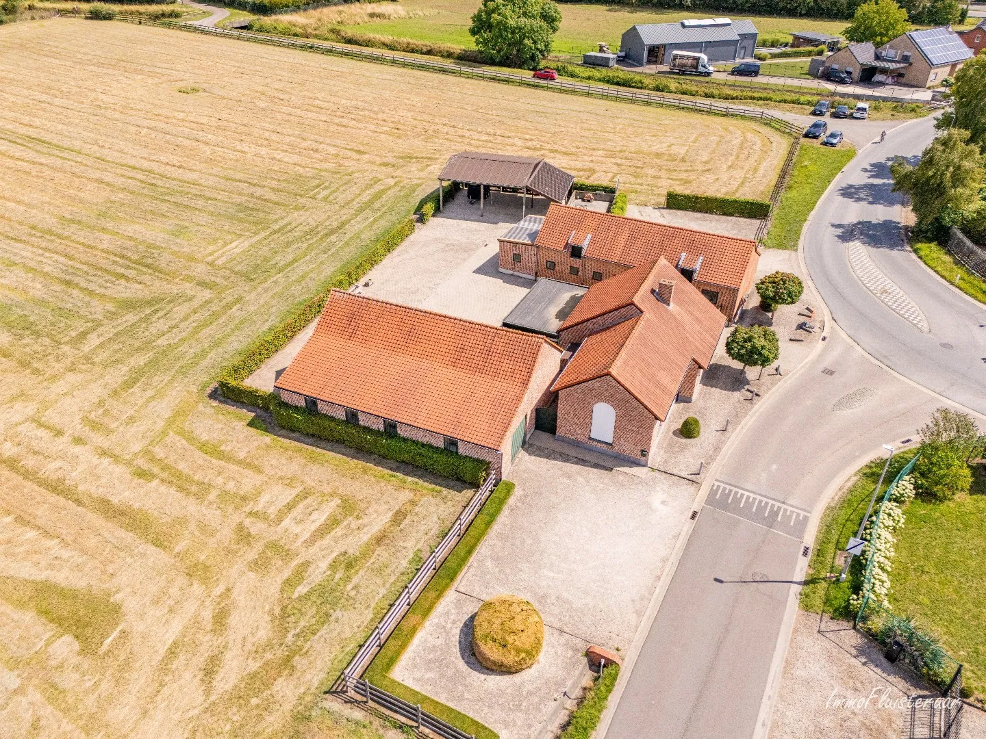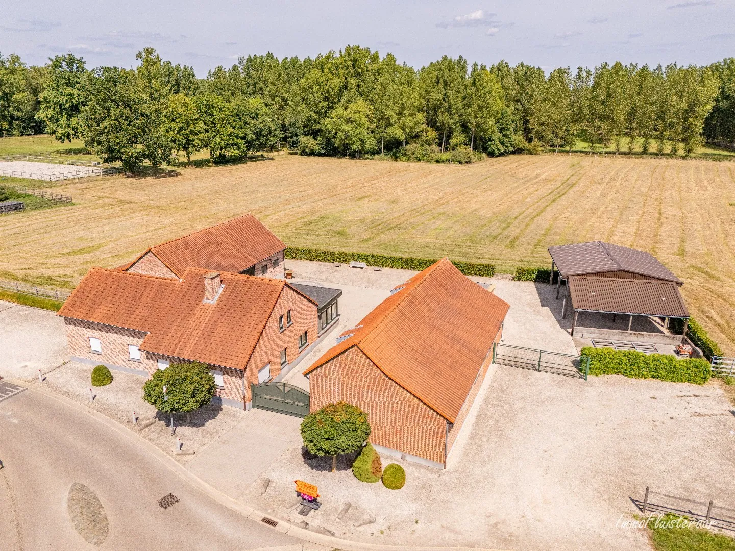 De buitenomgeving van deze hoeve is al even indrukwekkend. Op het domein bevinden zich twee ruime stalgebouwen, die een waaier aan invullingen mogelijk maken: van paardenstalling of dierenverblijf tot atelier of opslag. Een grote carport biedt plaats voor meerdere voertuigen.