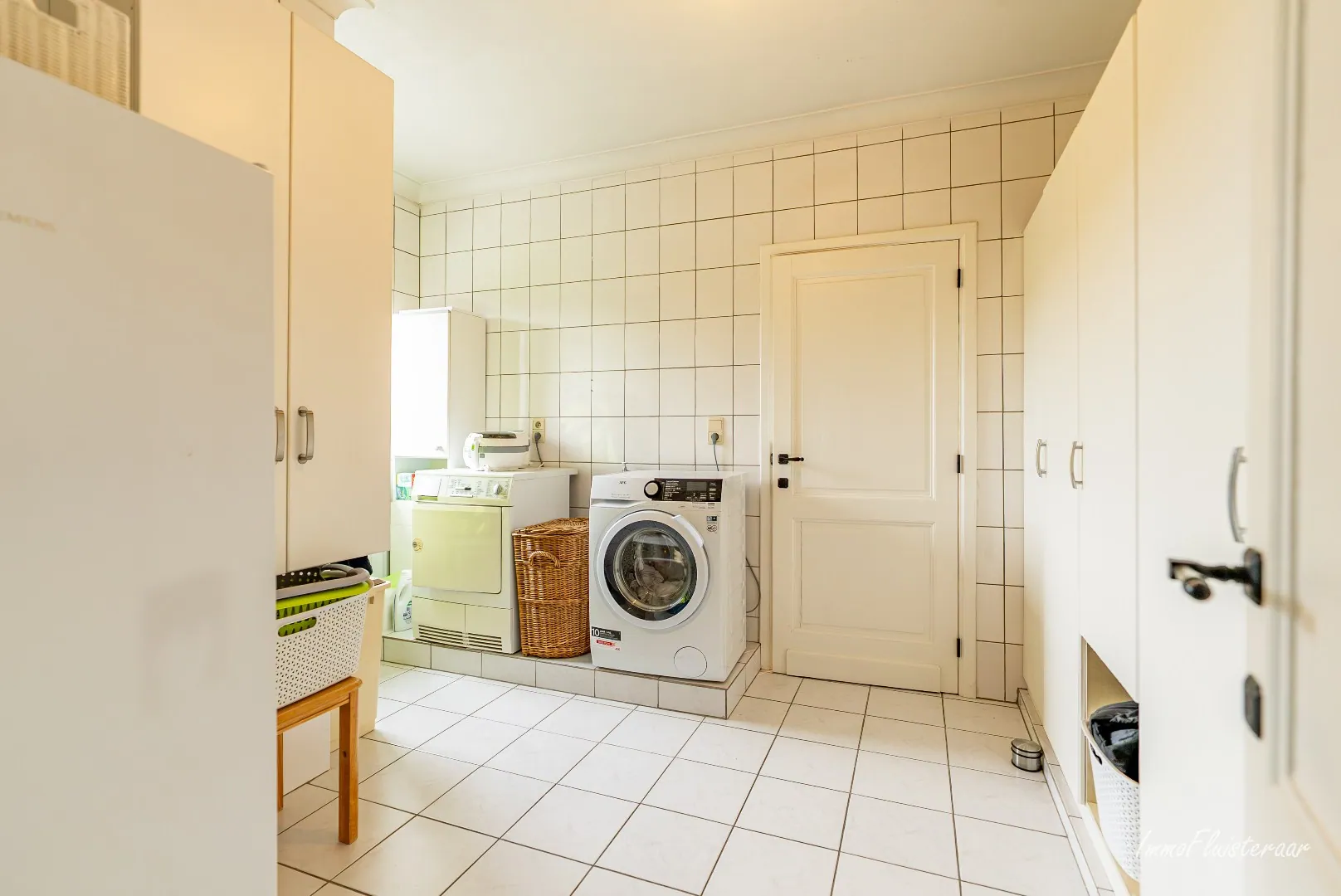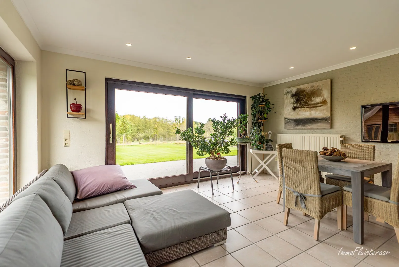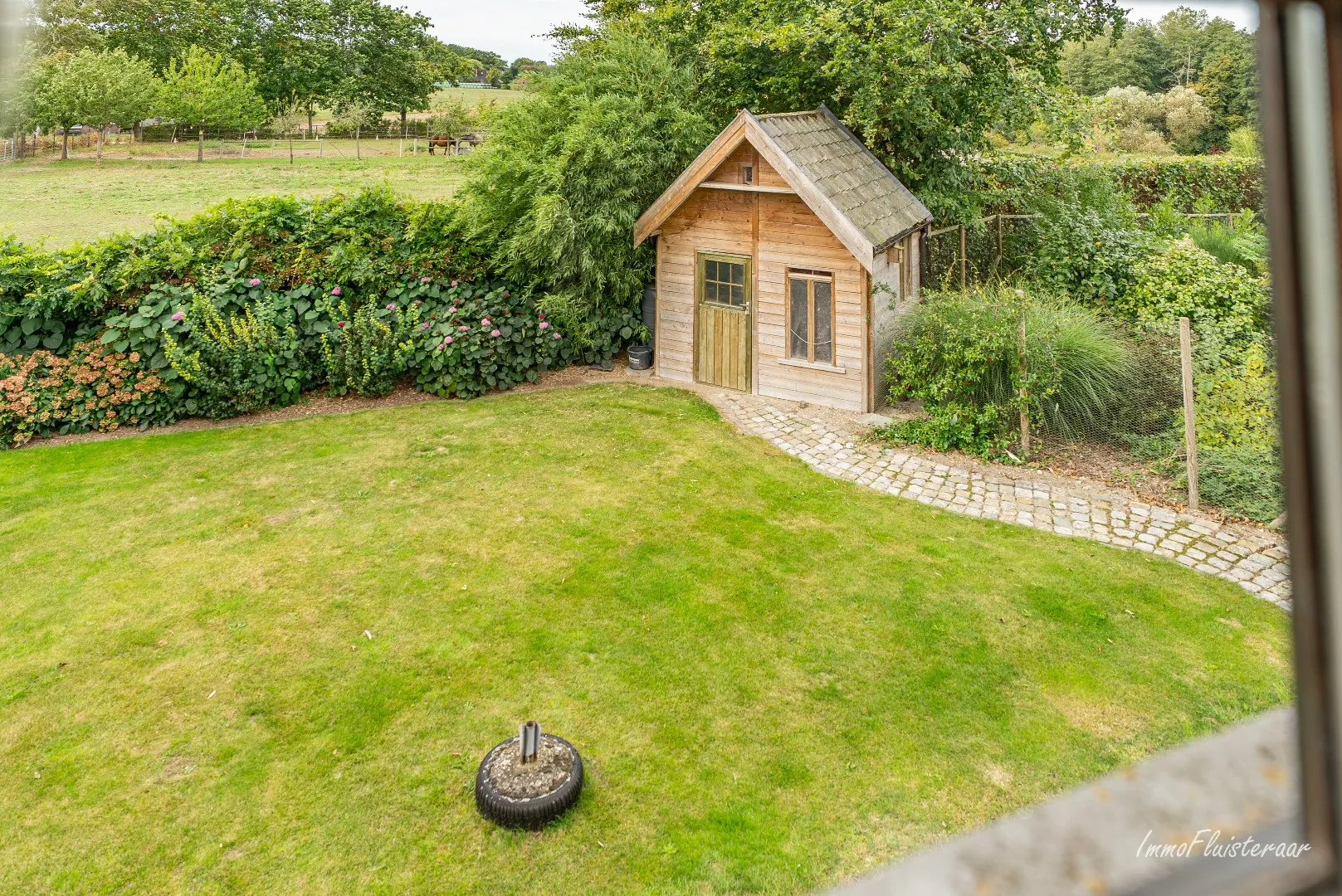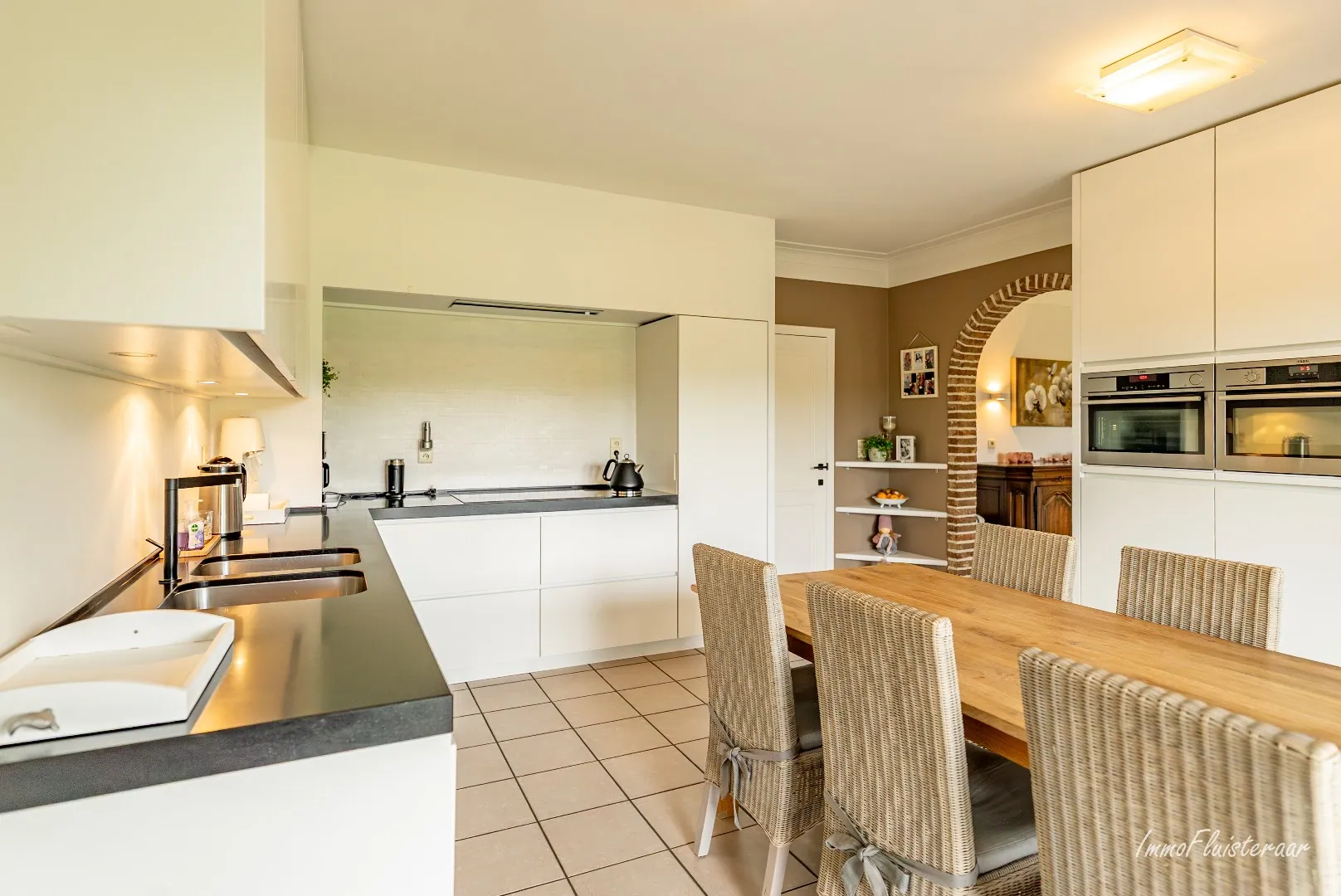 Op het gelijkvloers geniet je van grote raampartijen met een prachtig uitzicht over de tuin en omliggende weides. De inkomhal geeft toegang tot een ruime living, eetplaats en een keuken met zithoek. Verder vind je er een extra leefruimte/veranda, een wasplaats, een recent gerenoveerde badkamer met inloopdouche, een bureau en een ruime garage voor twee wagens.