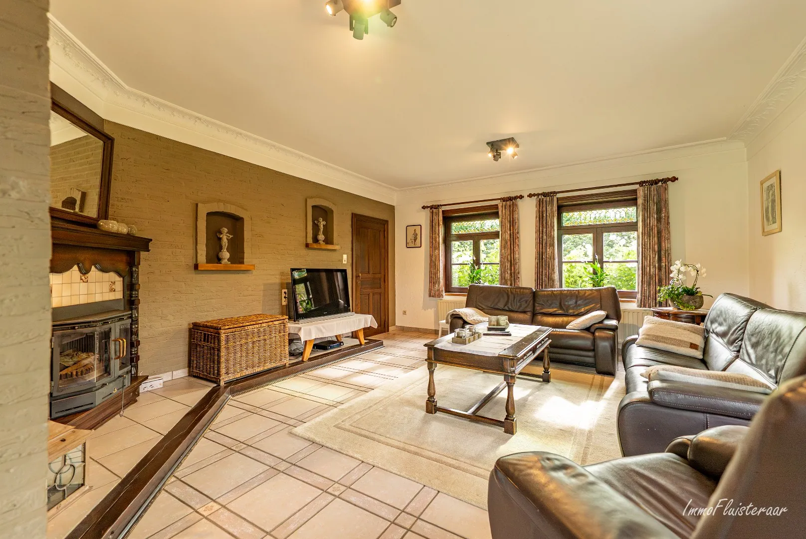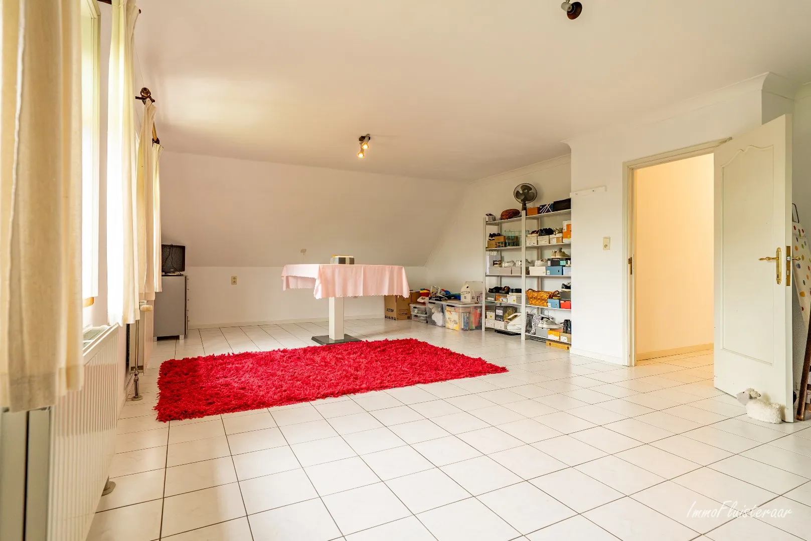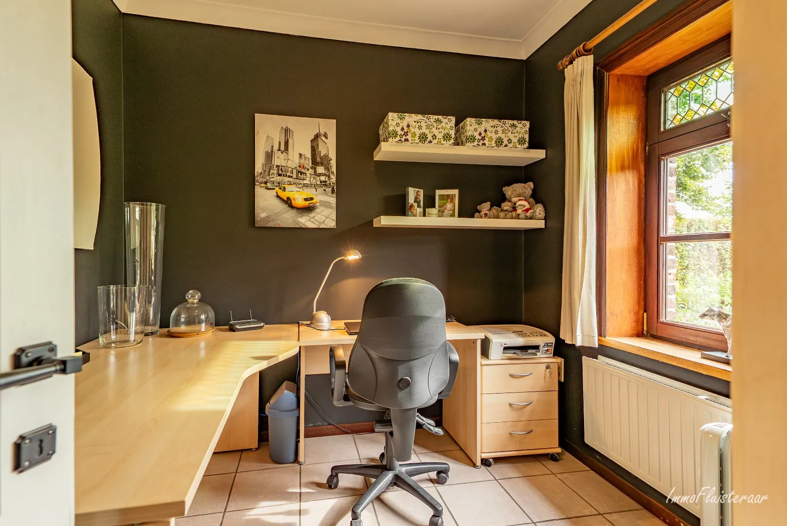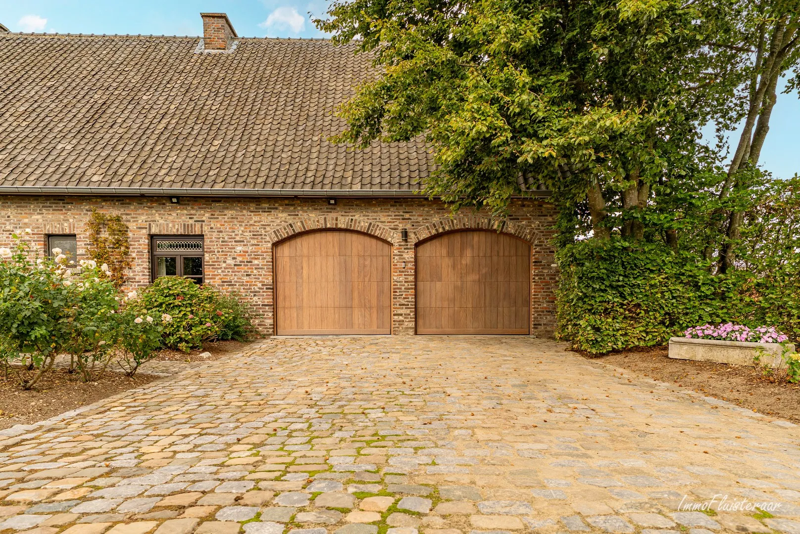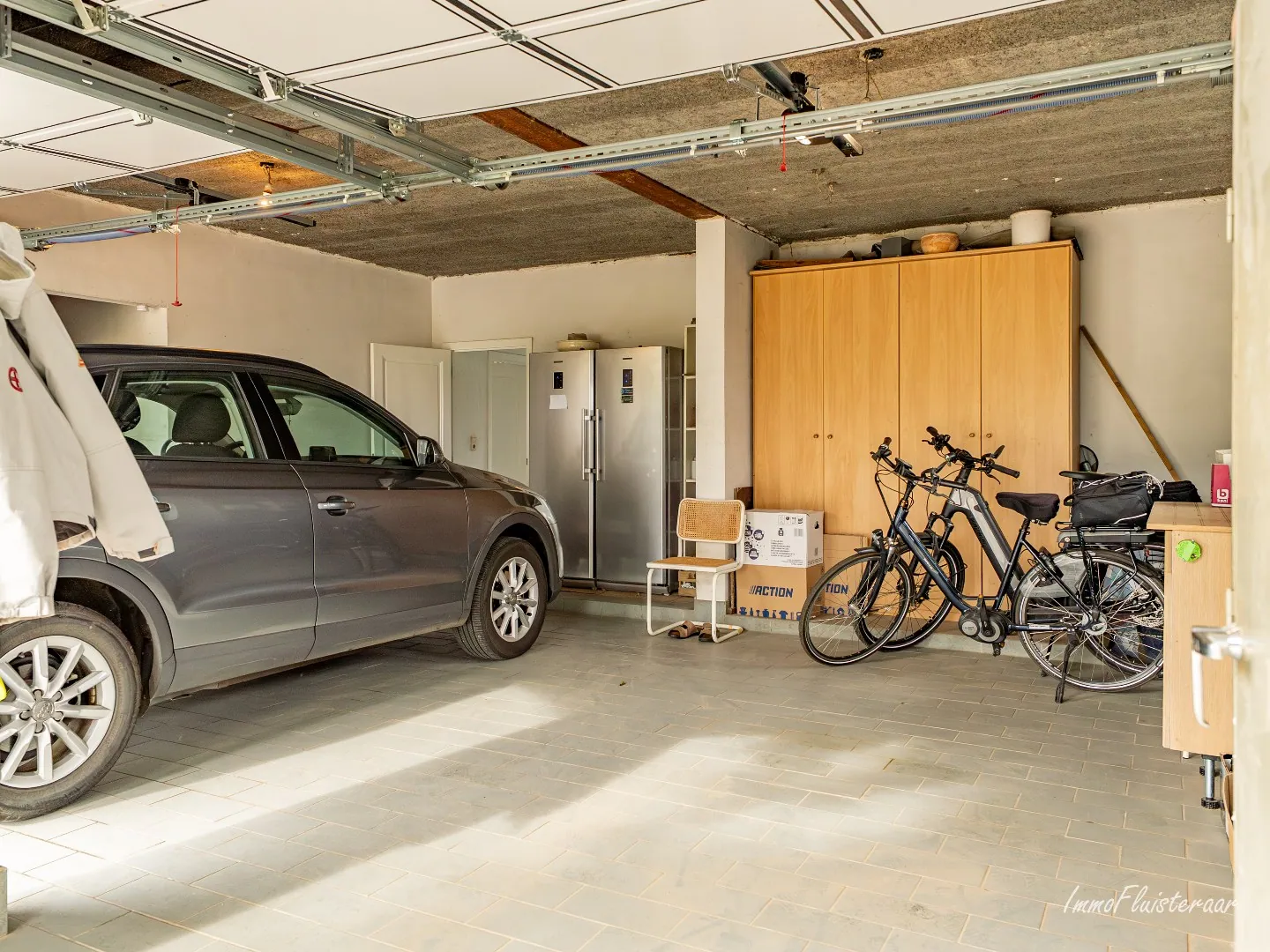 Op het gelijkvloers geniet je van grote raampartijen met een prachtig uitzicht over de tuin en omliggende weides. De inkomhal geeft toegang tot een ruime living, eetplaats en een keuken met zithoek. Verder vind je er een extra leefruimte/veranda, een wasplaats, een recent gerenoveerde badkamer met inloopdouche, een bureau en een ruime garage voor twee wagens.