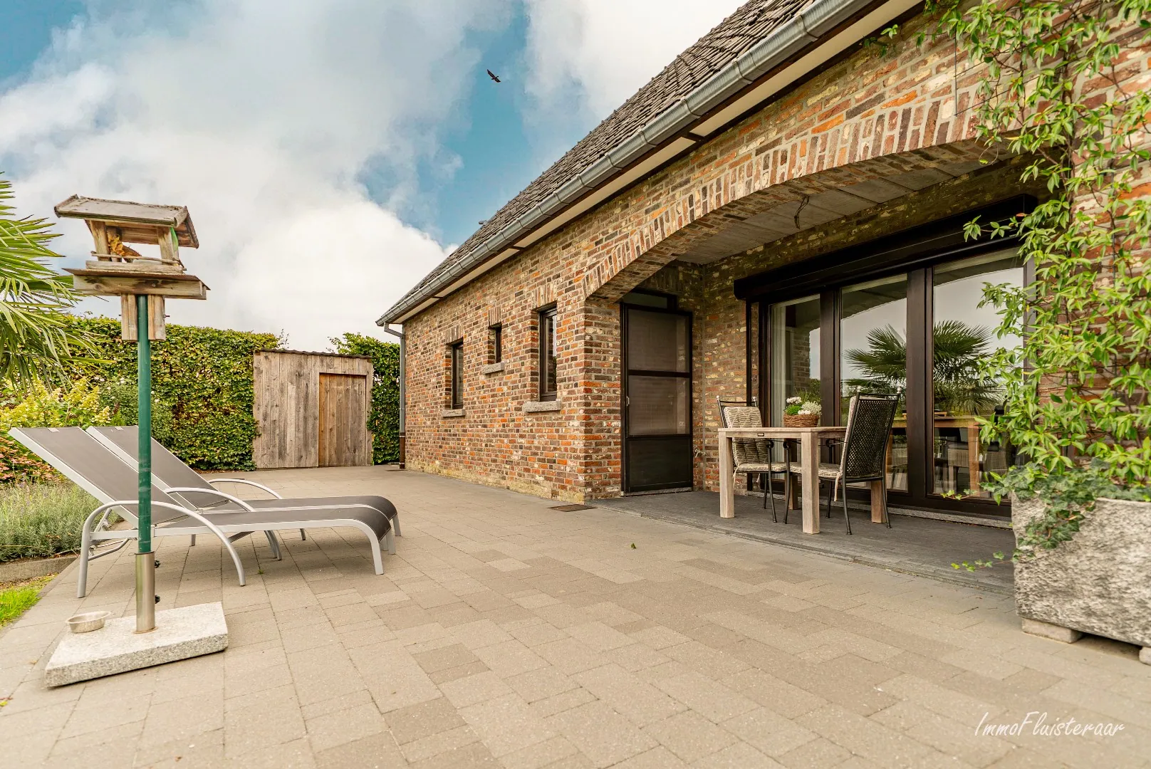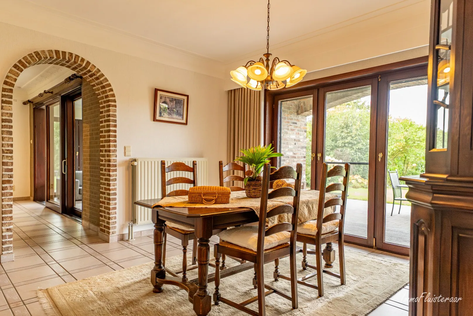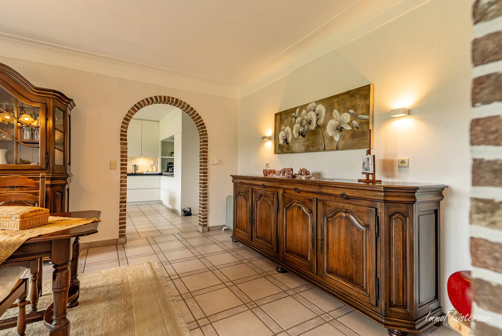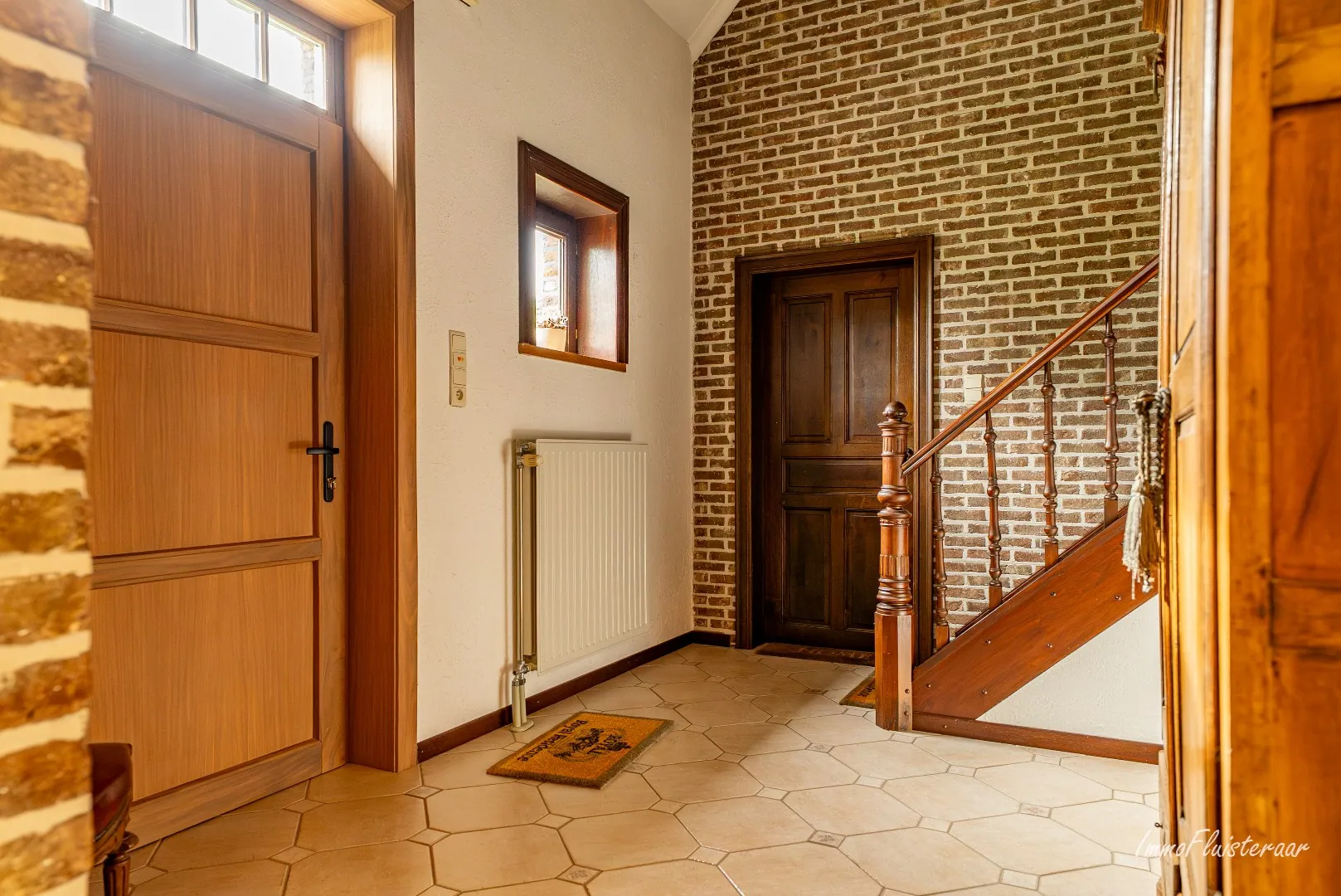 Op het gelijkvloers geniet je van grote raampartijen met een prachtig uitzicht over de tuin en omliggende weides. De inkomhal geeft toegang tot een ruime living, eetplaats en een keuken met zithoek. Verder vind je er een extra leefruimte/veranda, een wasplaats, een recent gerenoveerde badkamer met inloopdouche, een bureau en een ruime garage voor twee wagens.