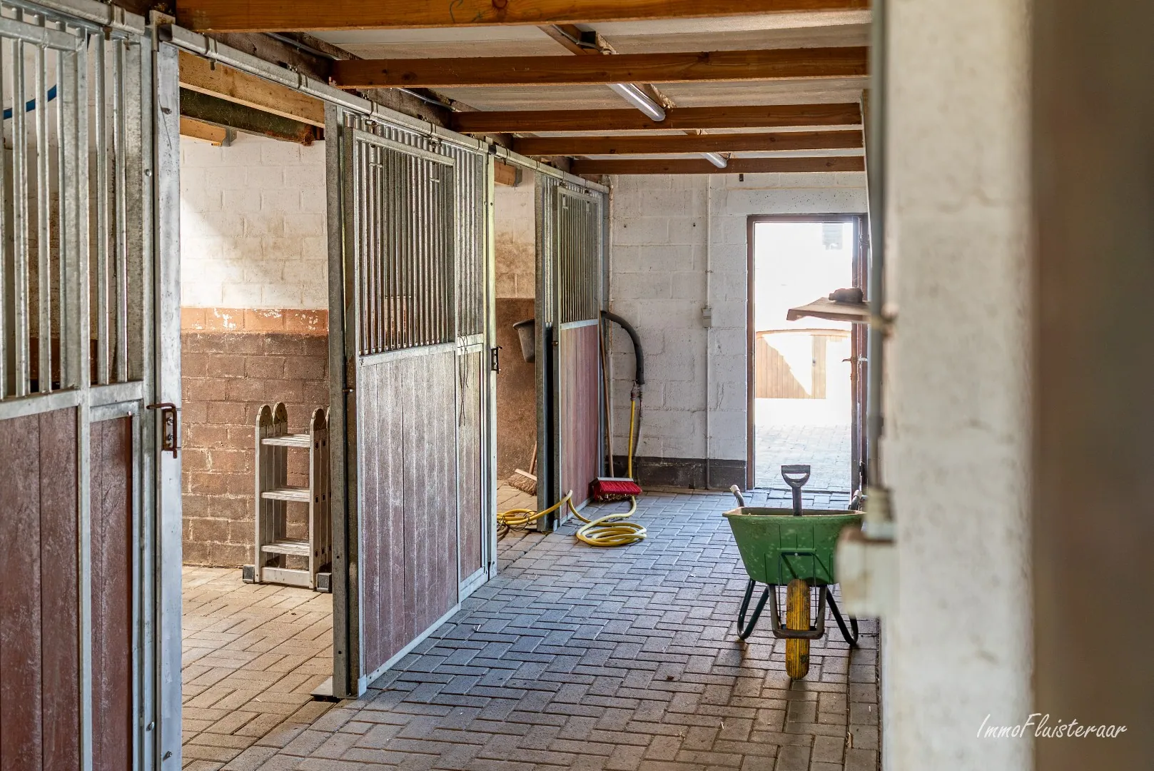 Achter de woning bevindt zich het recent gerenoveerde stalgebouw, voorzien van een nieuw geïsoleerd dak. Hier vindt u drie ruime paardenstallen, een poets-/wasplaats, een solarium en een grote garage. Boven de stallen is er voldoende ruimte voor de stockage van hooi en stro. Bovendien is er nog mogelijkheid om extra stallen bij te bouwen.