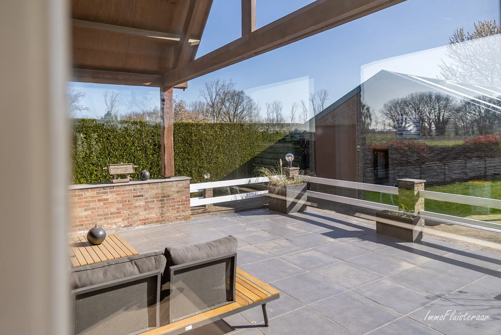 Buiten vormt het ruime overdekte terras een heerlijke plek om te genieten van de rust, de natuur en het uitzicht over het domein.