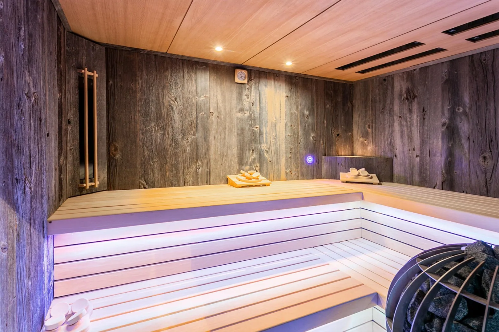 Anderzijds is dit gebouw ook ideaal voor een diner party of gewoon een gezellige avond met vrienden door aanwezigheid van de bar. Hier is tevens een sauna en grote douche voorzien alsook een apart toilet. Grote raampartijen naar de tuin zorgen ook hier voor heel veel licht en zicht.