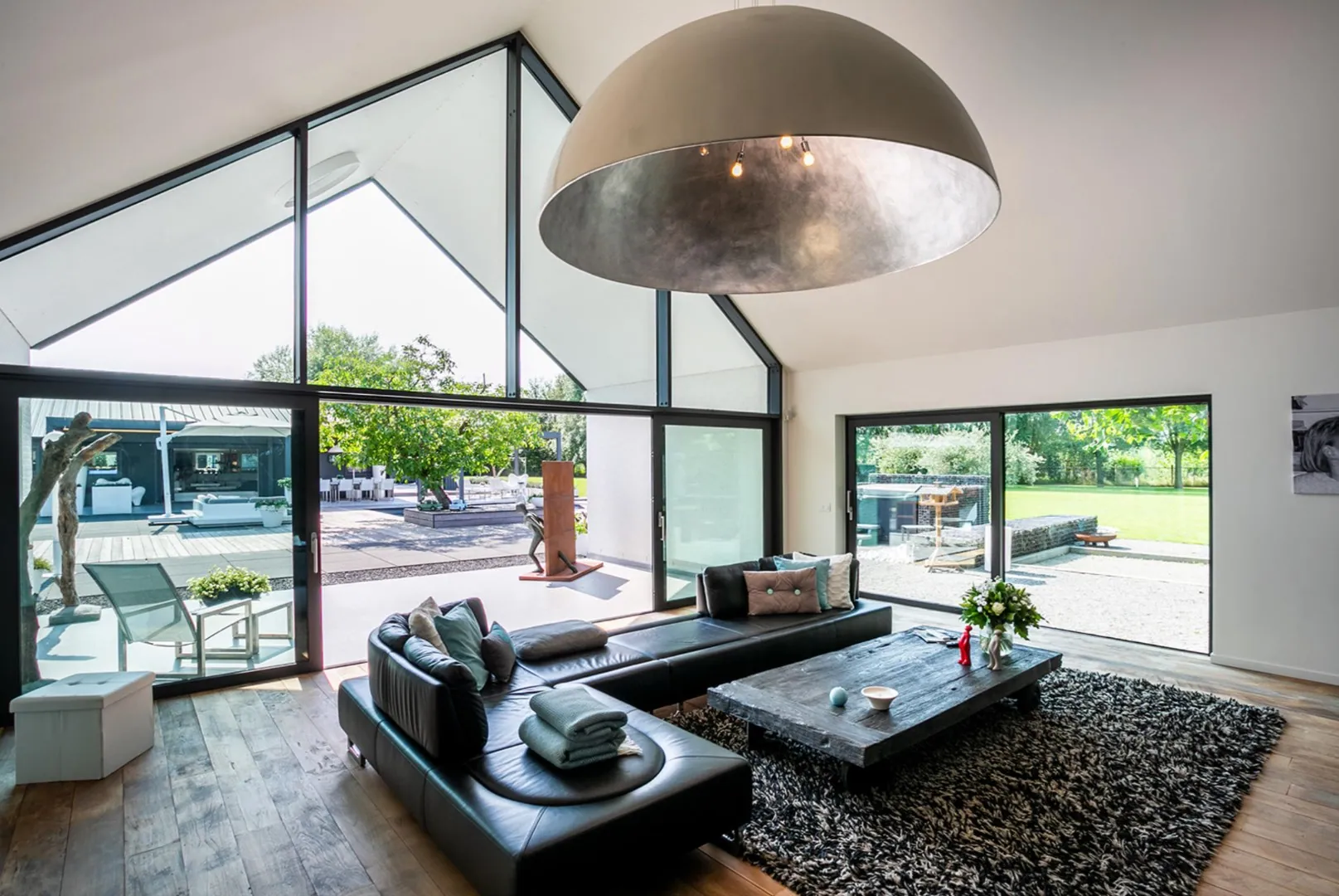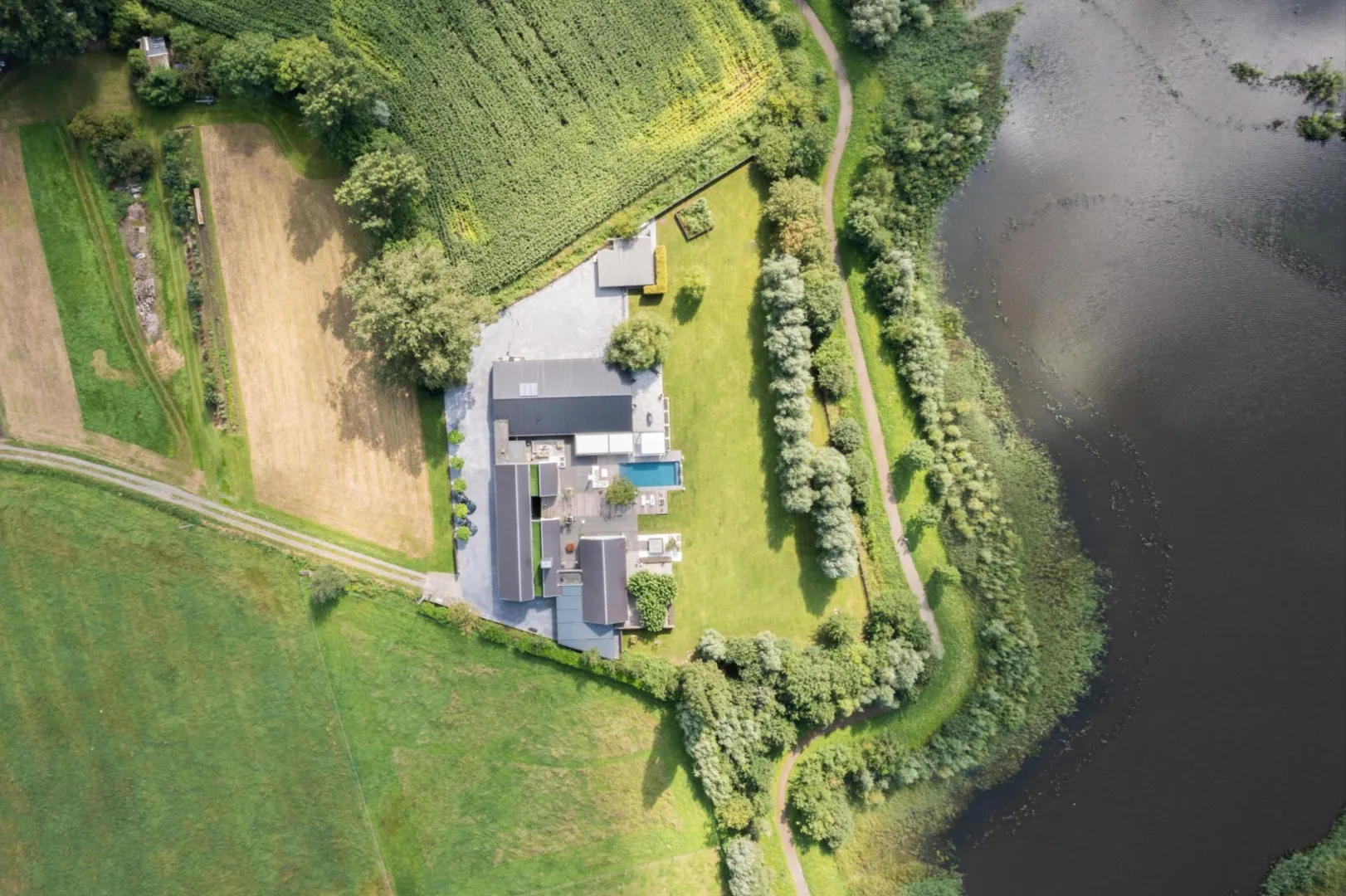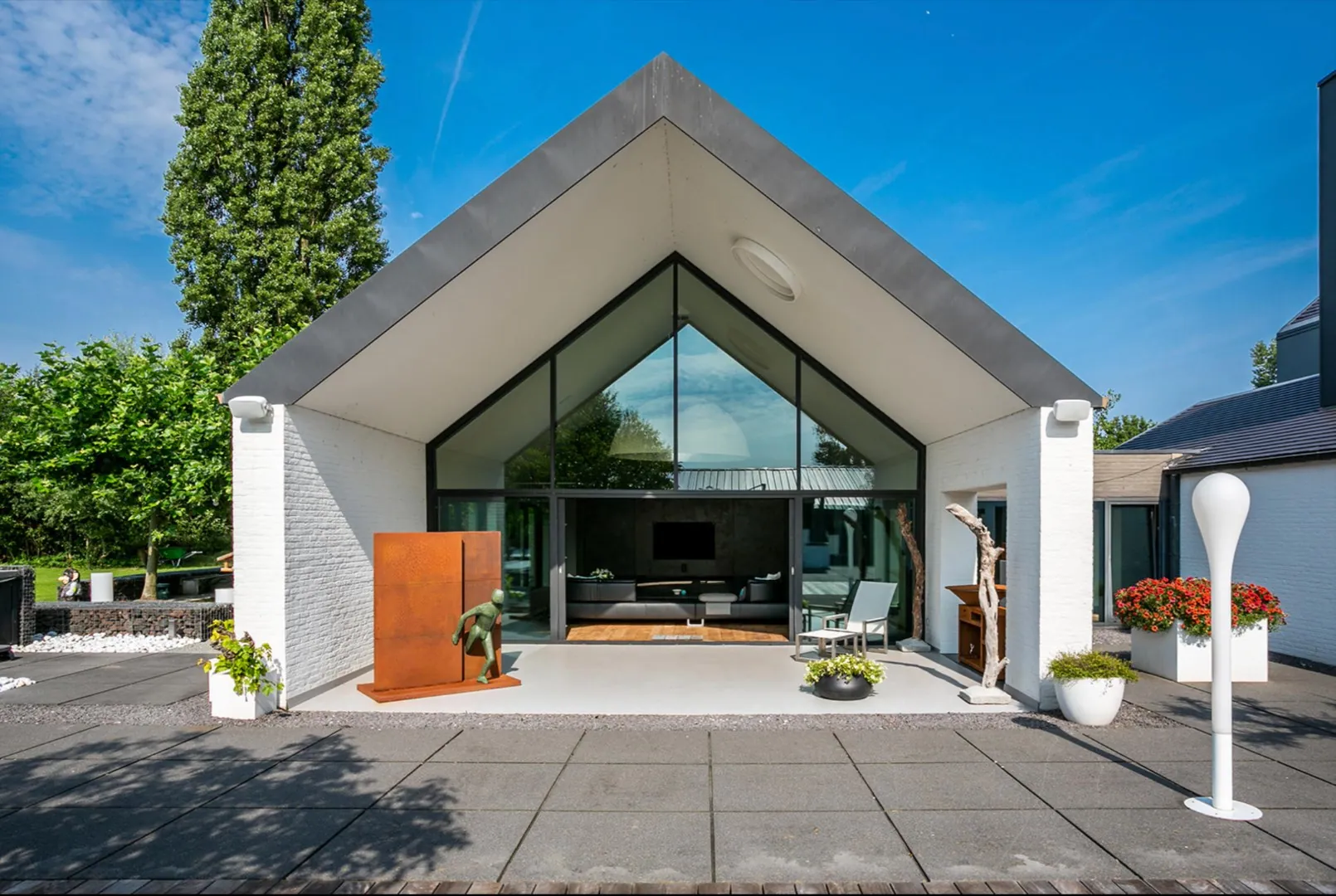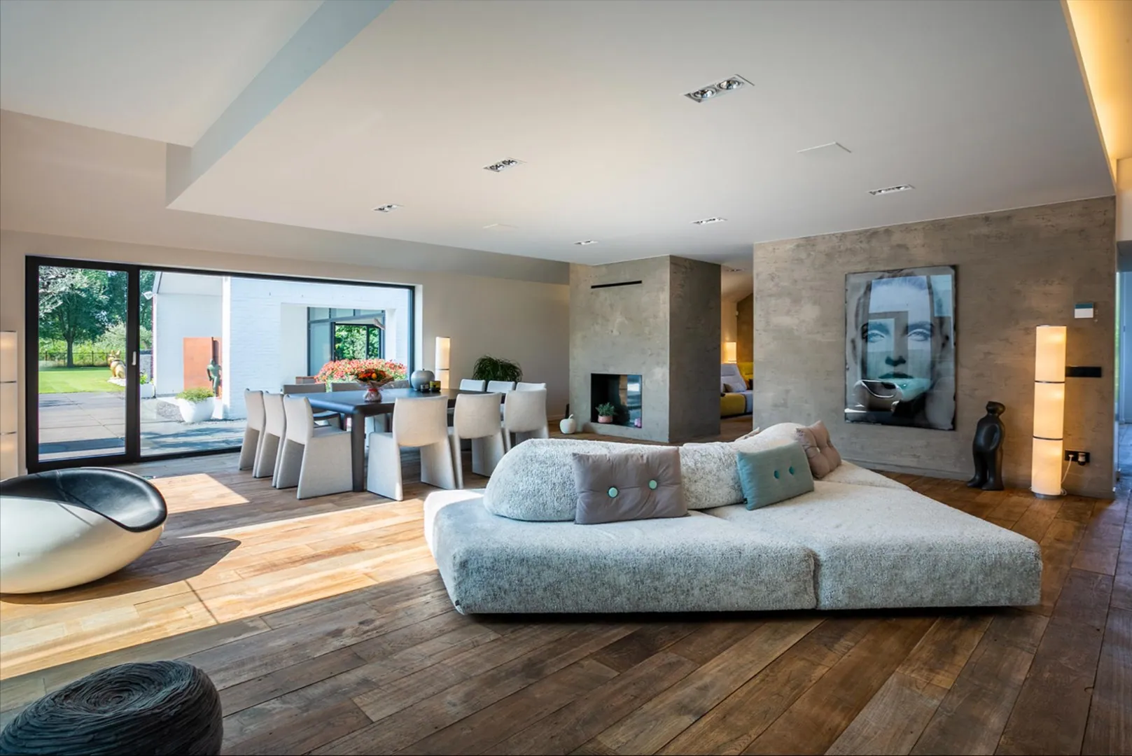 Zowel hoofd- als bijgebouw zijn voorzien van vloerverwarming, airco en domotica . Aan de andere zijde is er het bijgebouw van ca 300m² dat oorspronkelijk gebruikt werd als schuur maar tijdens de renovatie werd getransformeerd naar een unieke polyvalente ruimte met eindeloos veel mogelijkheden. Ook hier is een bar/keuken en apart toilet en badkamer. In dit gebouw bevindt zich ook de garage en de technische ruimte van de woning.