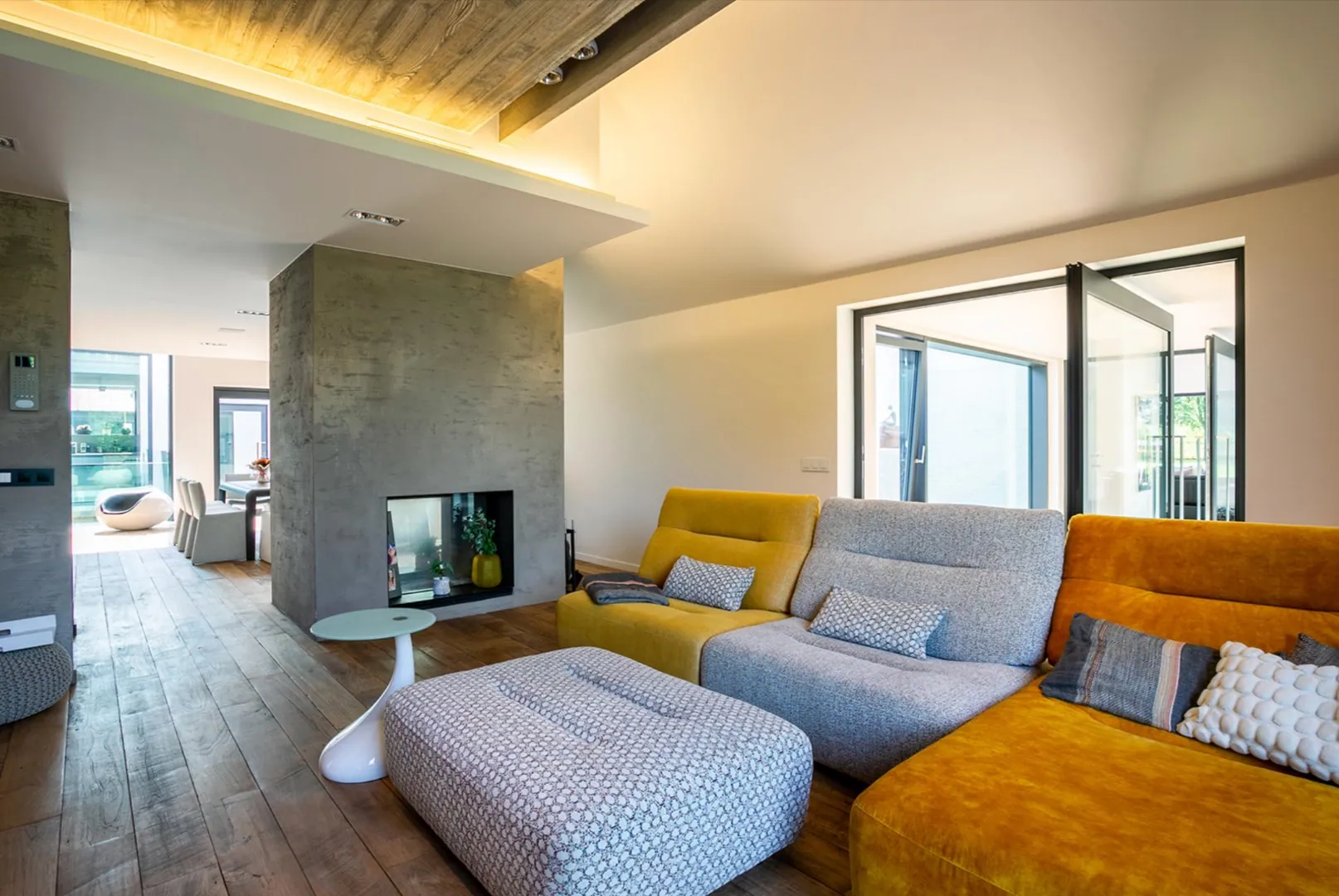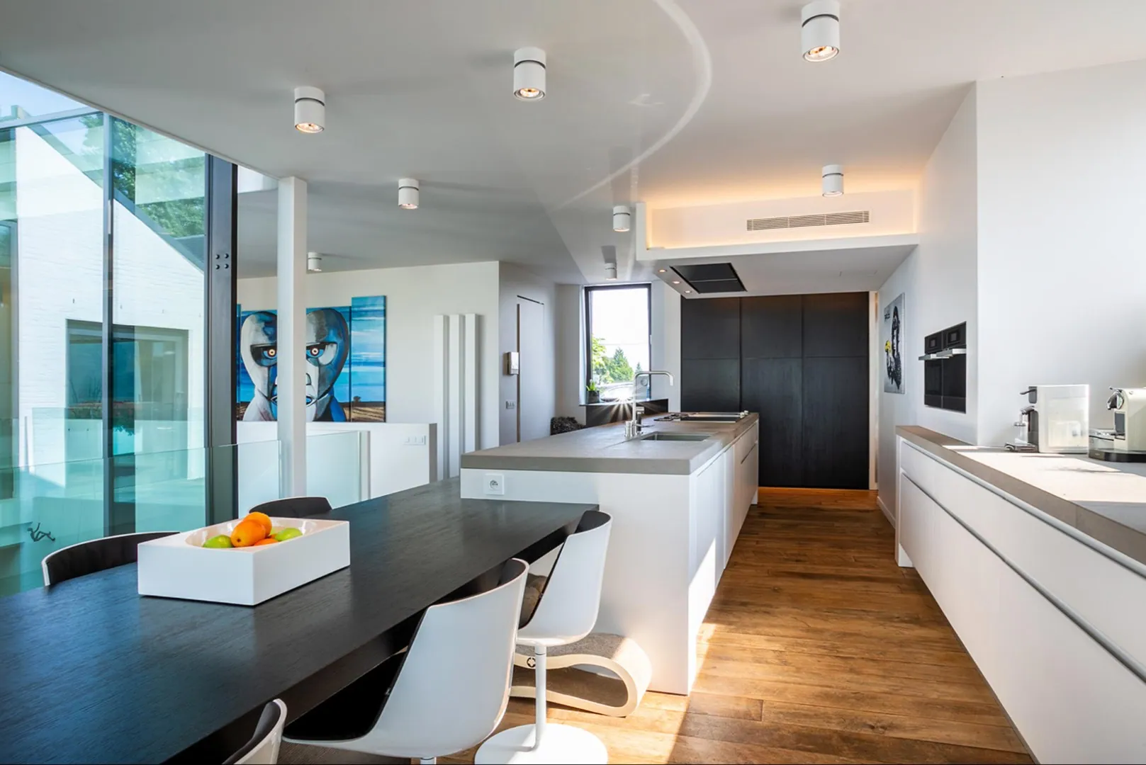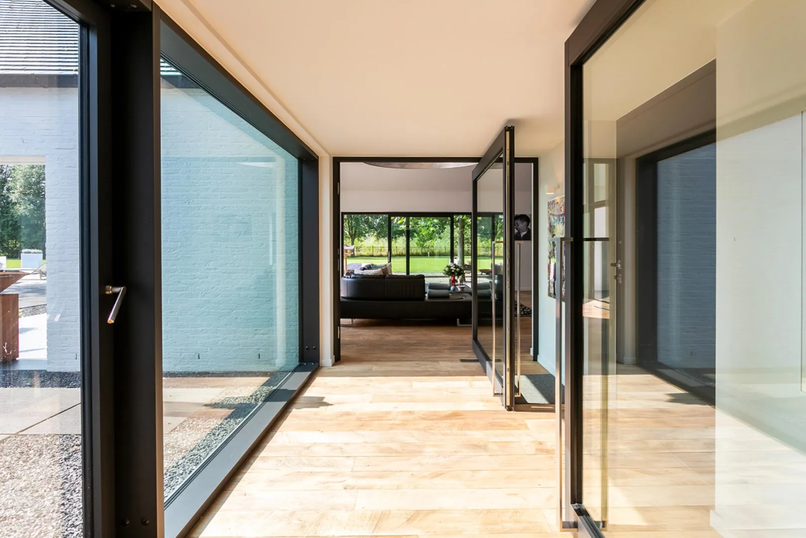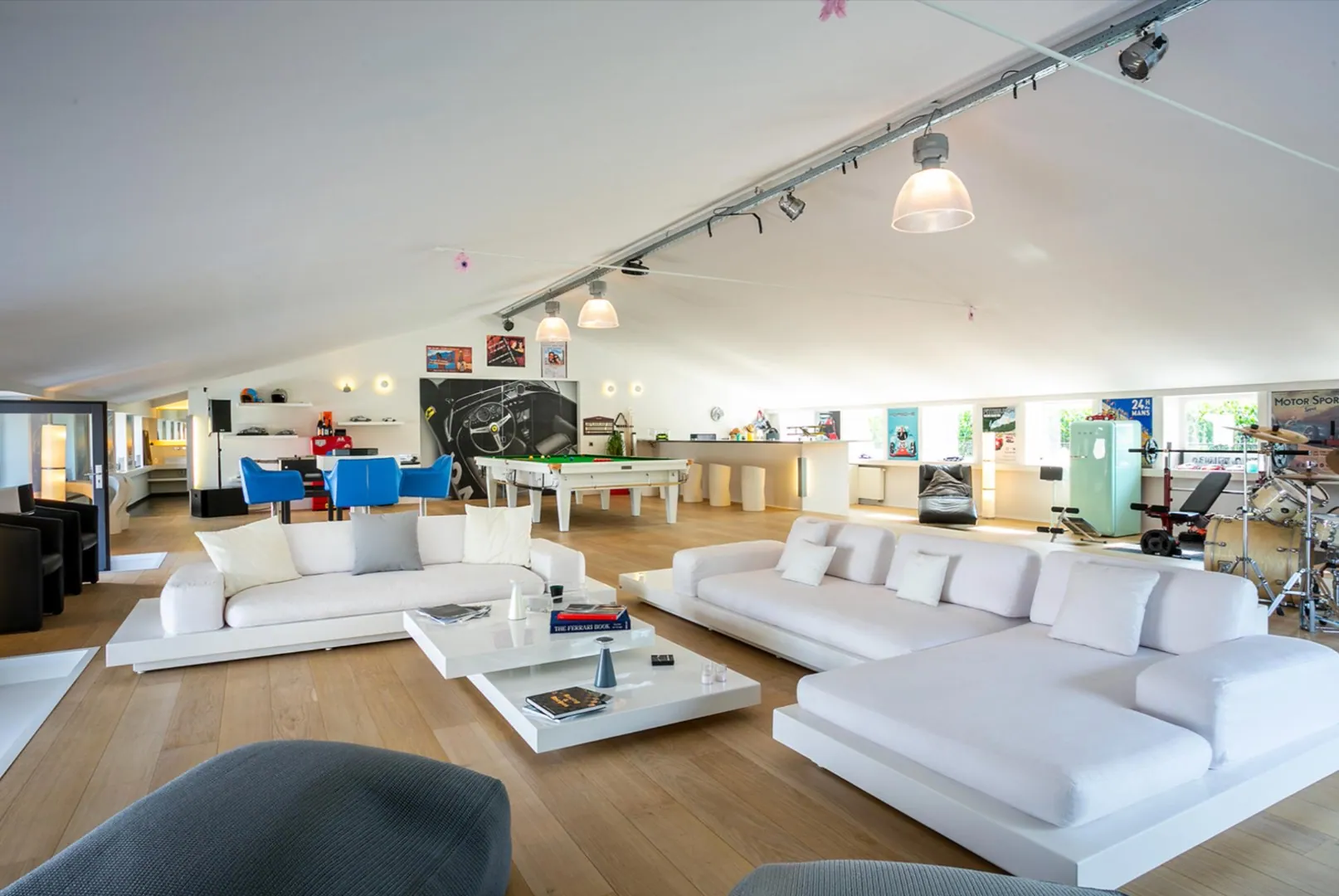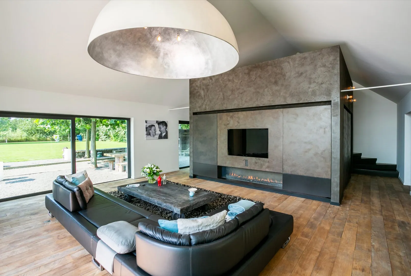 Zowel hoofd- als bijgebouw zijn voorzien van vloerverwarming, airco en domotica . Aan de andere zijde is er het bijgebouw van ca 300m² dat oorspronkelijk gebruikt werd als schuur maar tijdens de renovatie werd getransformeerd naar een unieke polyvalente ruimte met eindeloos veel mogelijkheden. Ook hier is een bar/keuken en apart toilet en badkamer. In dit gebouw bevindt zich ook de garage en de technische ruimte van de woning.
