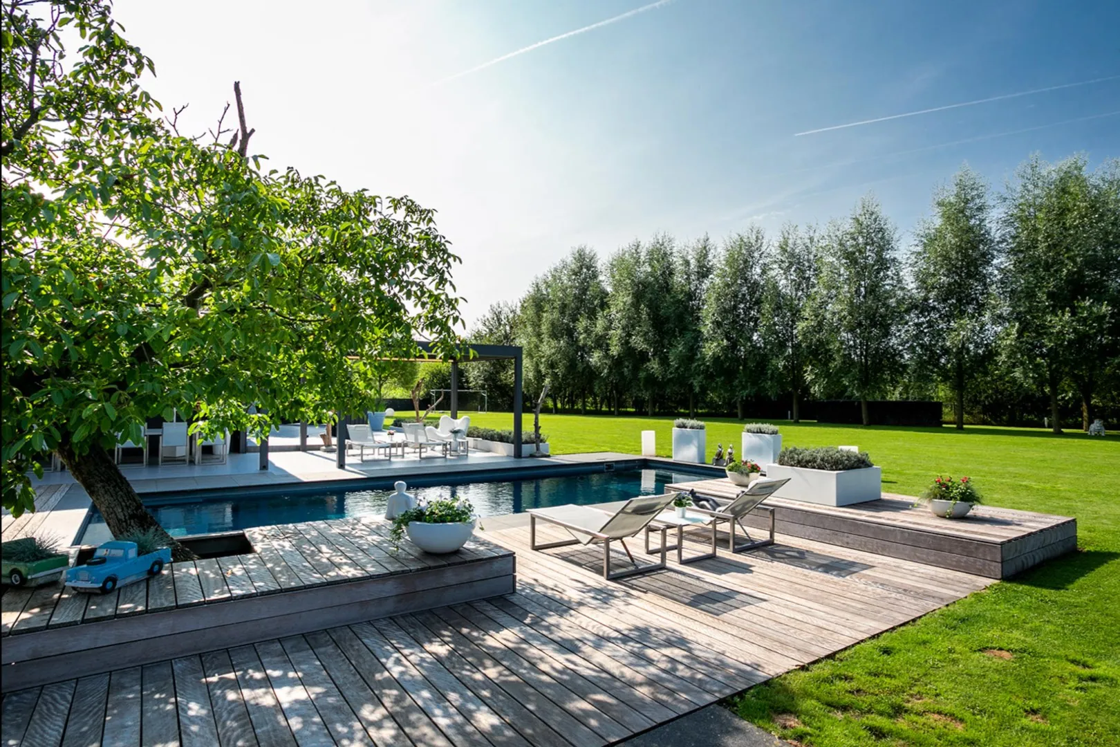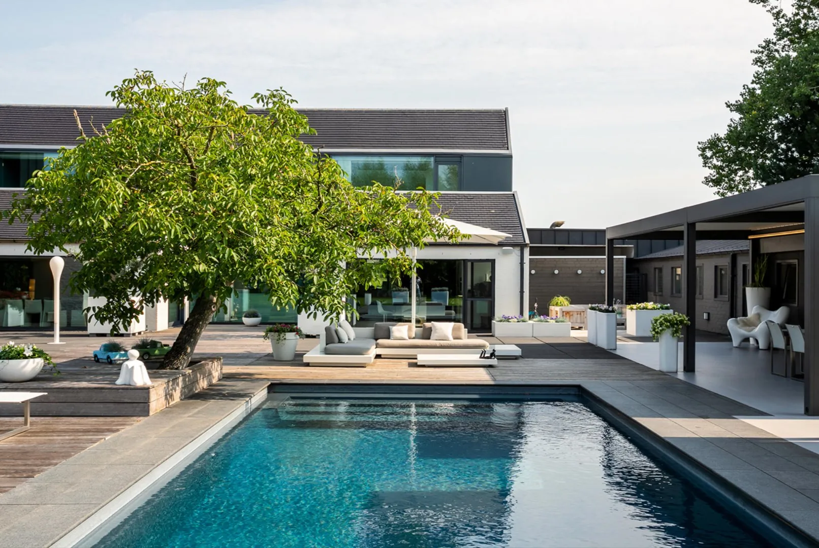 Tussen de gebouwen ligt het luxe verwarmde zwembad, omringd door ruime terrassen en overkappingen. De volwassen tuin werd volledig met oog voor detail aangelegd en is in perfecte staat van onderhoud. Er is tevens een ruime tuinberging voorzien. Voor de wagens is er een carport, een afgesloten garage en heel wat parkeerplaatsen op de oprit.