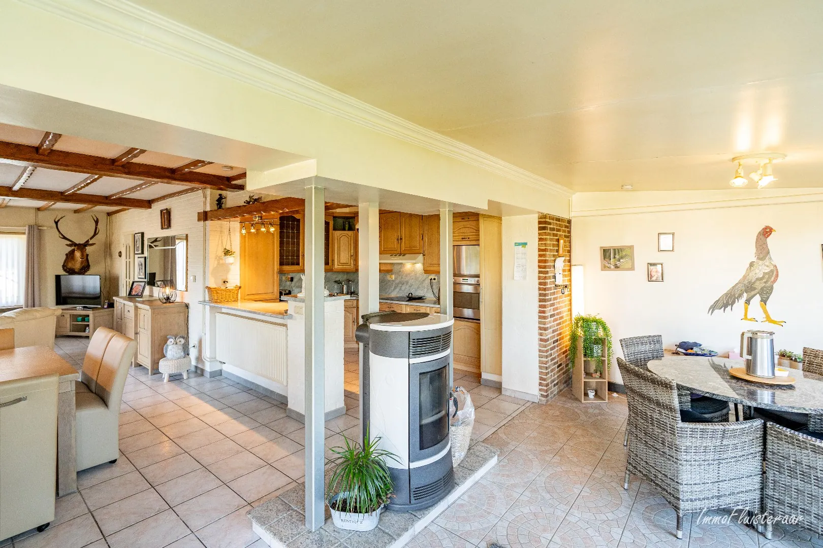 - Een living met veel lichtinval en een pelletkachel