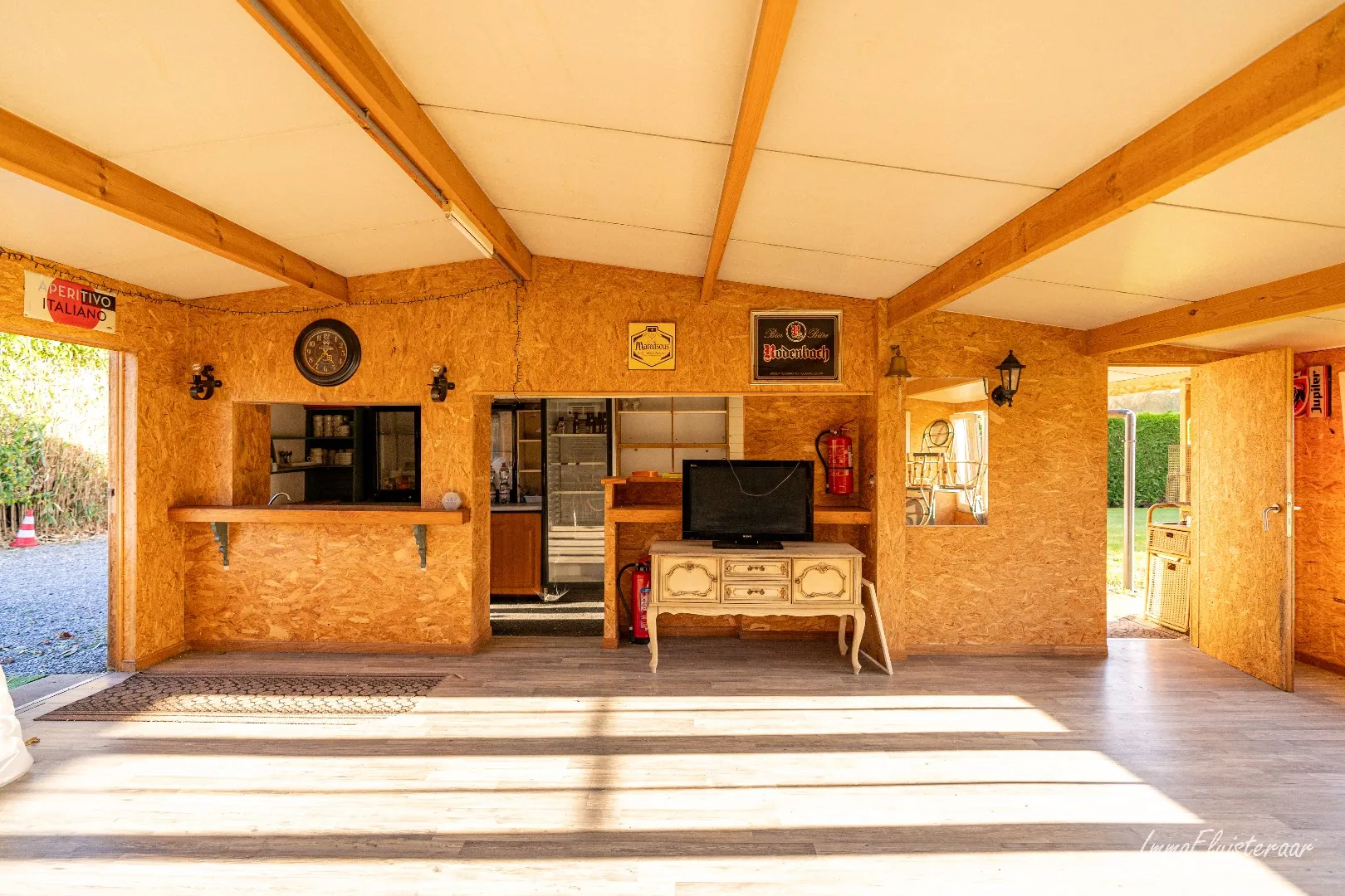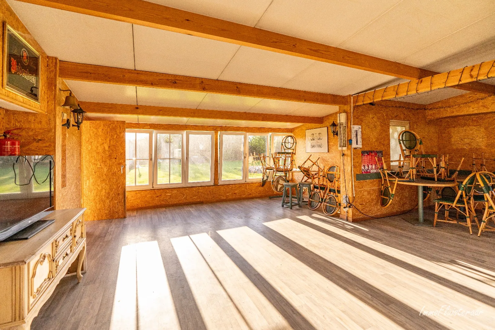 - Een cafetaria met palletkachel en bar