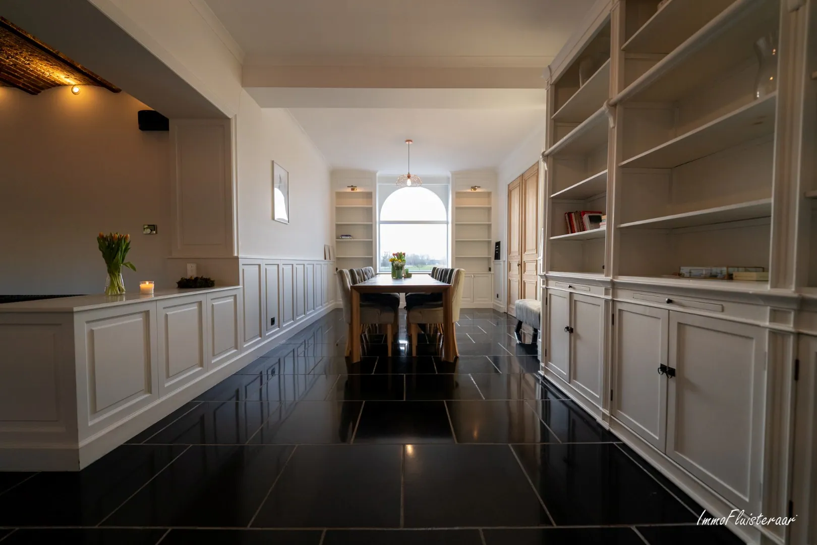 Niet enkel de paarden worden verwend op dit eigendom, deze prachtig gerenoveerde villa biedt een warme, luxueuze thuis. Geniet van de ruimte en de authenticiteit die de hoge plafonds en de gemetselde welfsels in de eetkamer en de woonkamer bieden. De prachtige, landelijke keuken geeft zicht op de buitenpiste en de weides enerzijds en is anderzijds direct verbonden met het terras op de gezellige binnenkoer.