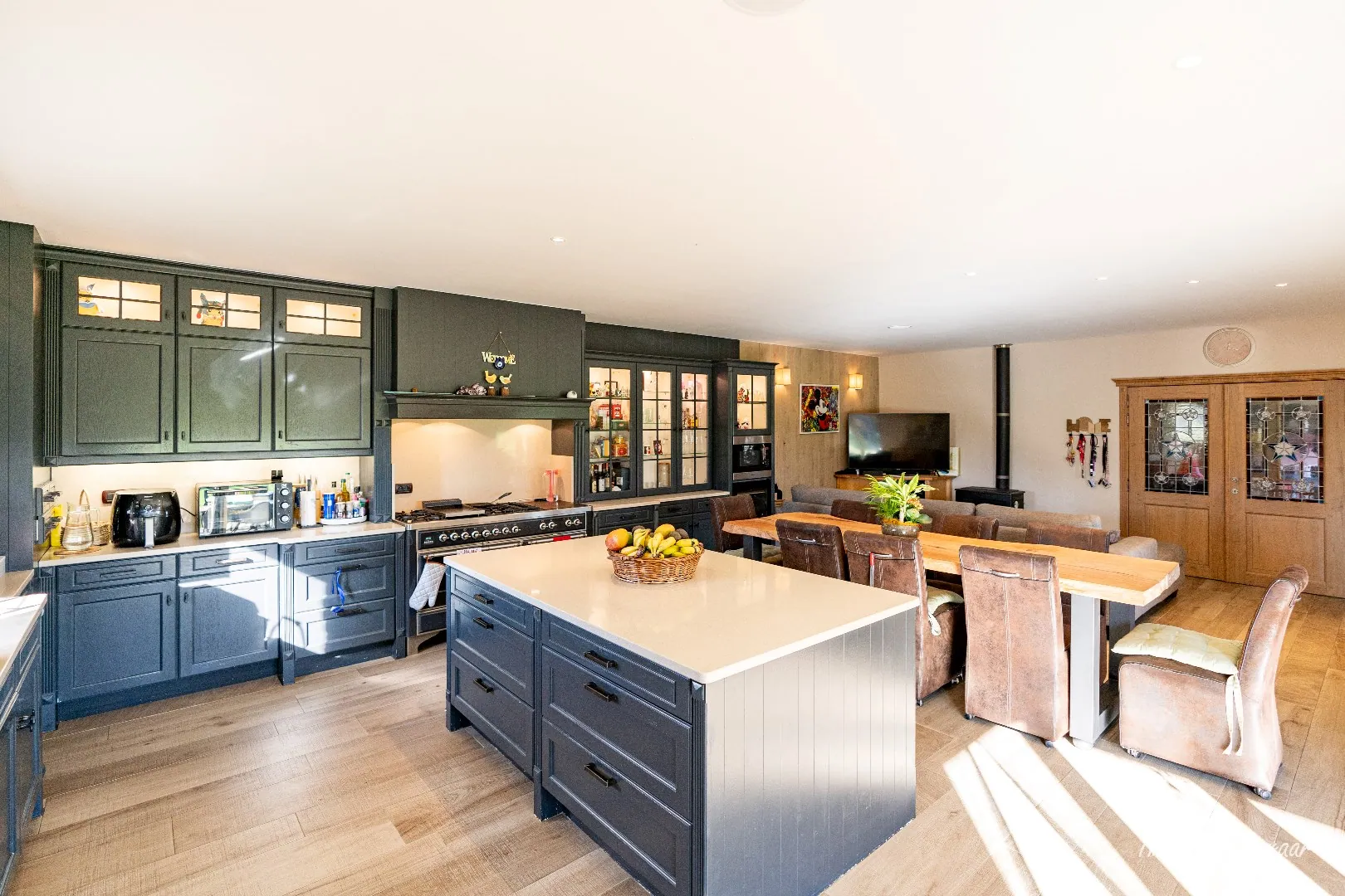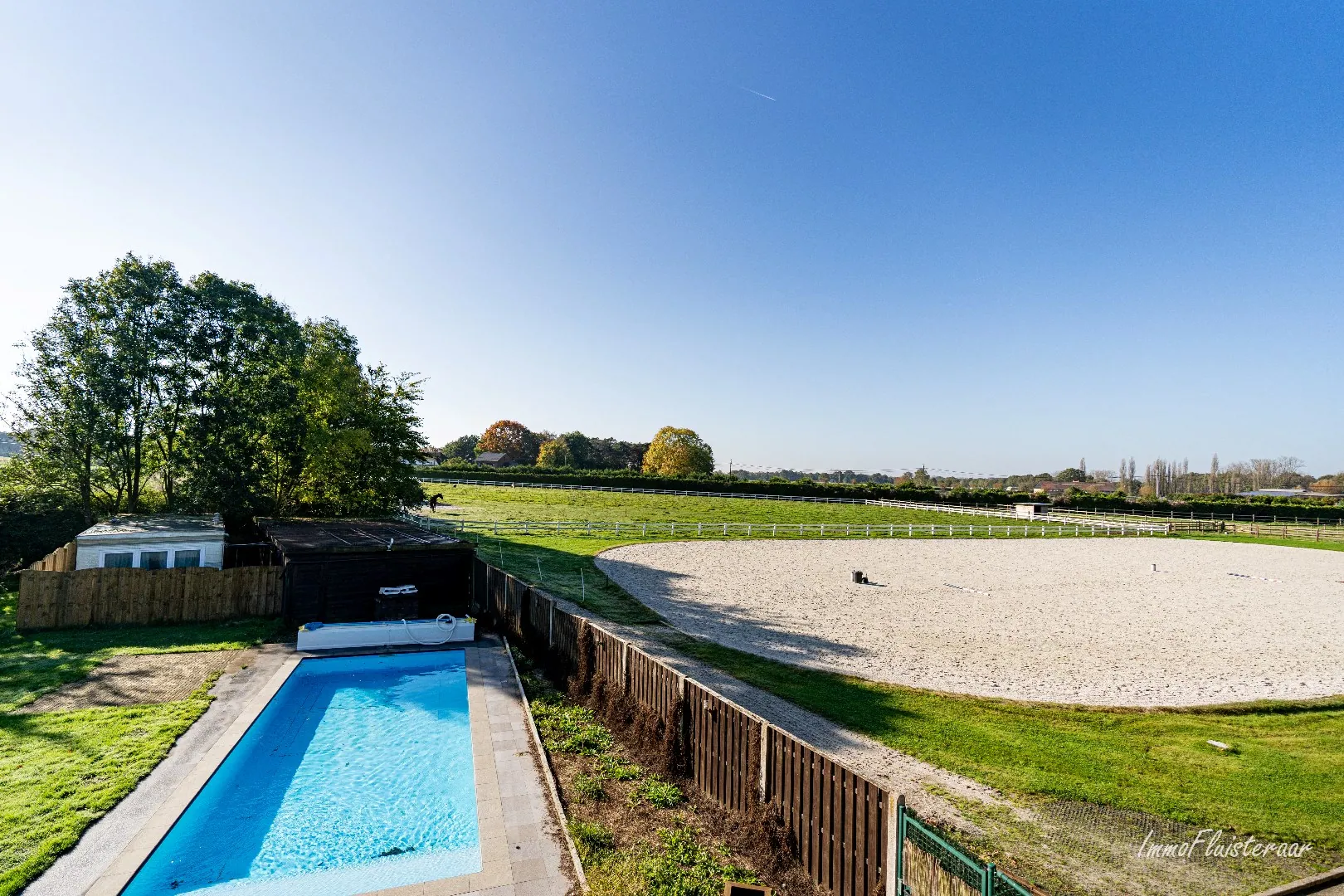 De ruime, inpandige woning biedt een zeer grote, luxueus ingerichte leefkeuken met eiland. Vanuit de keuken is er toegang tot het overdekte terras, de ruime woonkamer biedt doorgang naar het stalgedeelte. Op de eerste verdieping zijn er 4 ruime slaapkamers, allemaal voorzien van airco (zowel koelen als verwarmen). Eén van deze slaapkamers is voorzien van een groot terras en een dressing. De badkamer is uitgerust met een ligbad, een inloopdouche en een dubbele lavabo. Tevens is er op deze verdieping nog een speelkamer die eventueel ook kan dienen als slaapkamer.