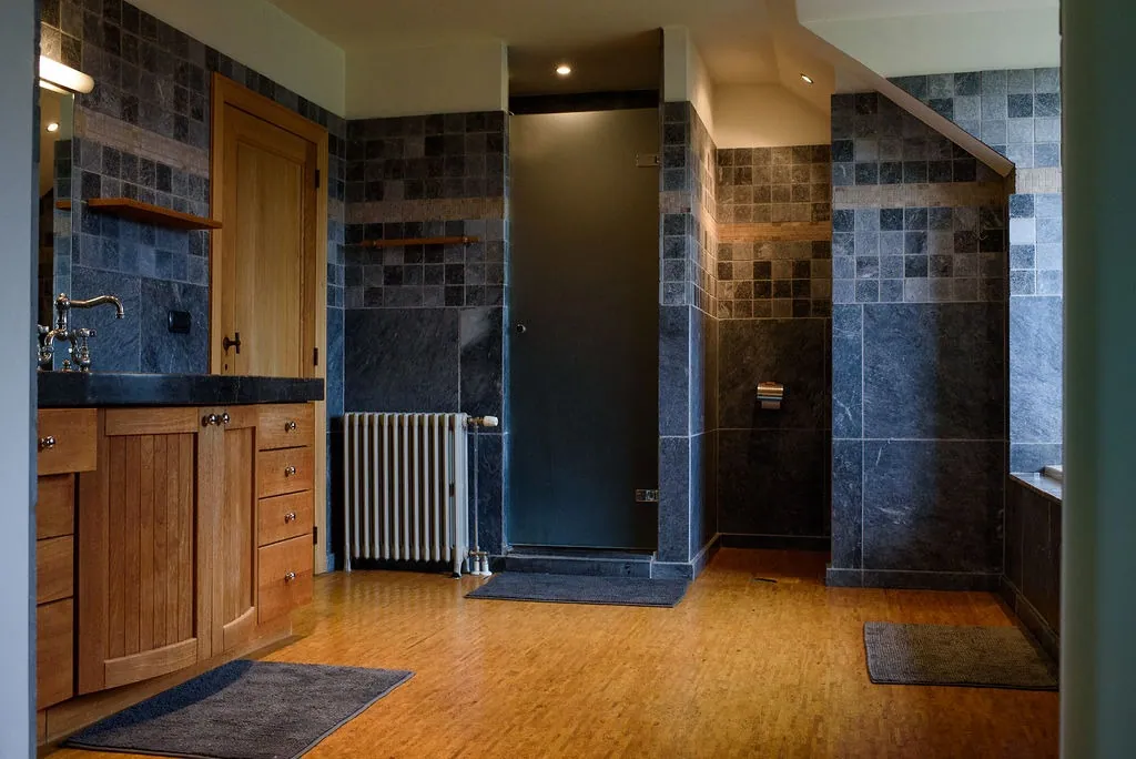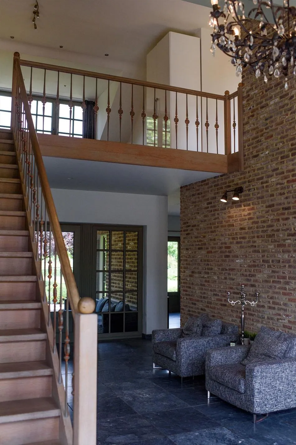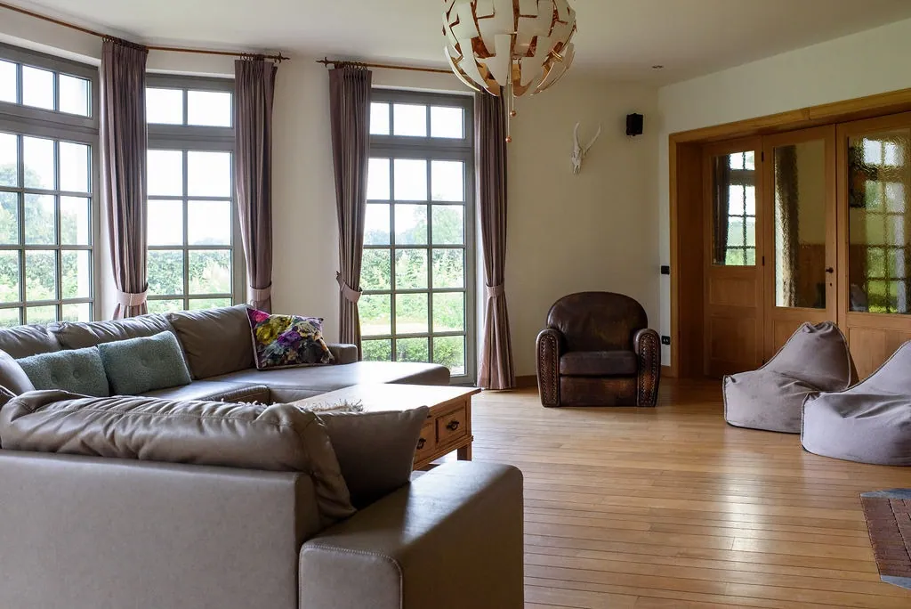 Het geheel is bereikbaar via een prachtige lange oprijlaan die uitkomt op de binnenplaats. Het woongedeelte beschikt over mooie leefruimtes met authentieke materialen. Het gebruik van houten parketvloeren, kurk en andere luxueuze materialen geven de woning een duurzame en warme uitstraling. De leefruimtes genieten tevens van overvloedig zonlicht door de grote raampartijen en er is toegang naar het terras waar men heerlijk kan vertoeven.