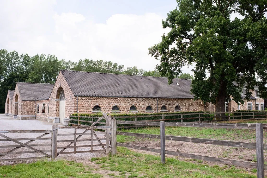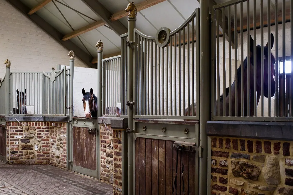 Aan de andere kant van de binnenplaats liggen de stallen en de binnenpiste. De binnenpiste meet ca. 22m x 40m. Via de trap langs de piste is er toegang tot de ontvangstruimte. Daarbij is er een apart toilet en douchekamer. Vanuit het deze ruimte is er een mooi zicht op de binnenpiste enerzijds en de stallen anderzijds. Langs de stallen is er nog een inpandige stapmolen voor 4 paarden. Verder zijn er verschillende poets- en wasplaatsen, een solarium en zadelkamers. In het gebouw zijn er in totaal 29 boxen evenals 5 grote veulenstallen aanwezig. Deze panelen kunnen draaien zodat de stallen machinaal kunnen worden uitgemest.