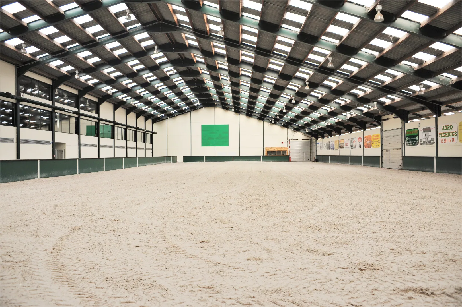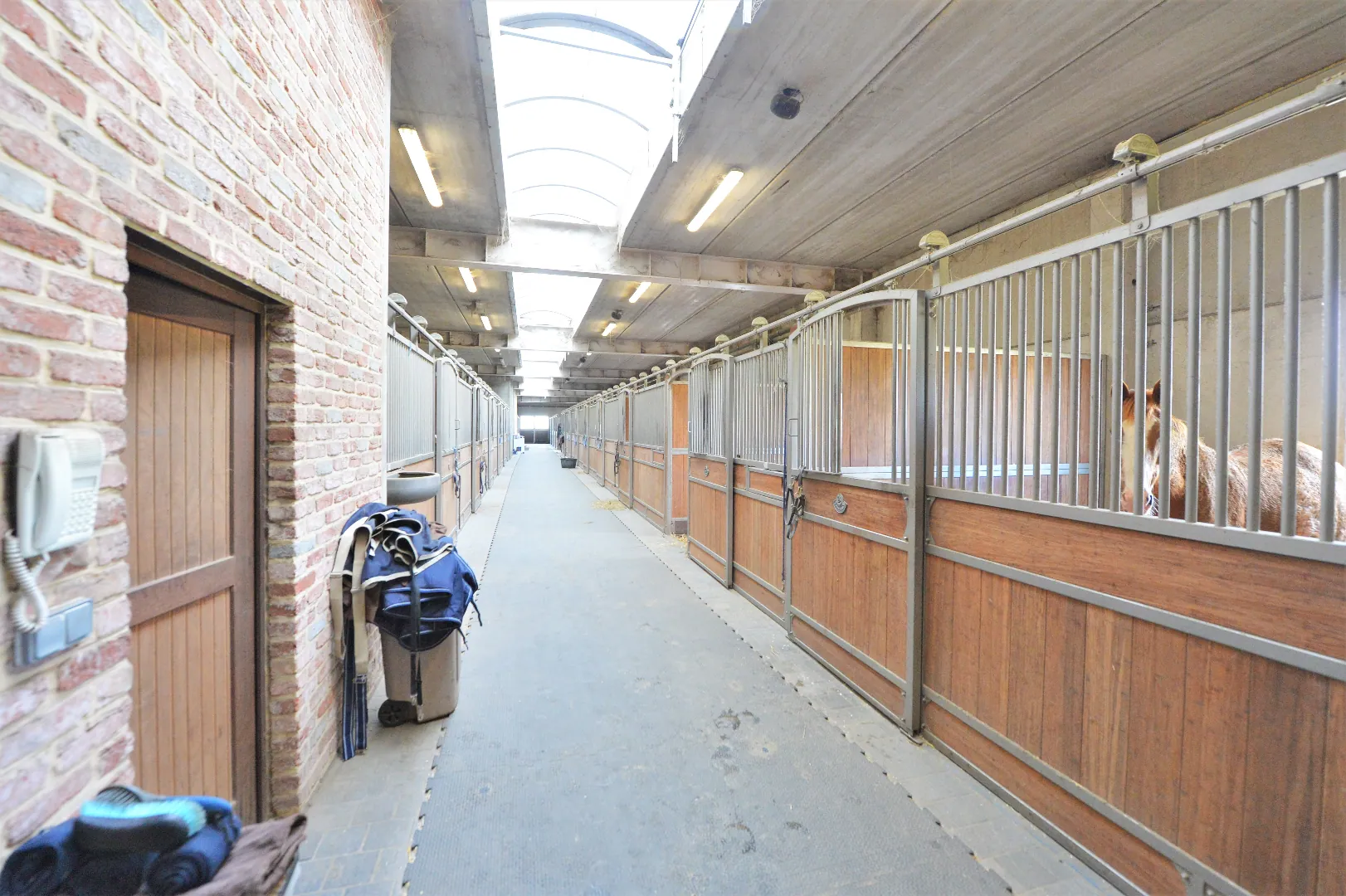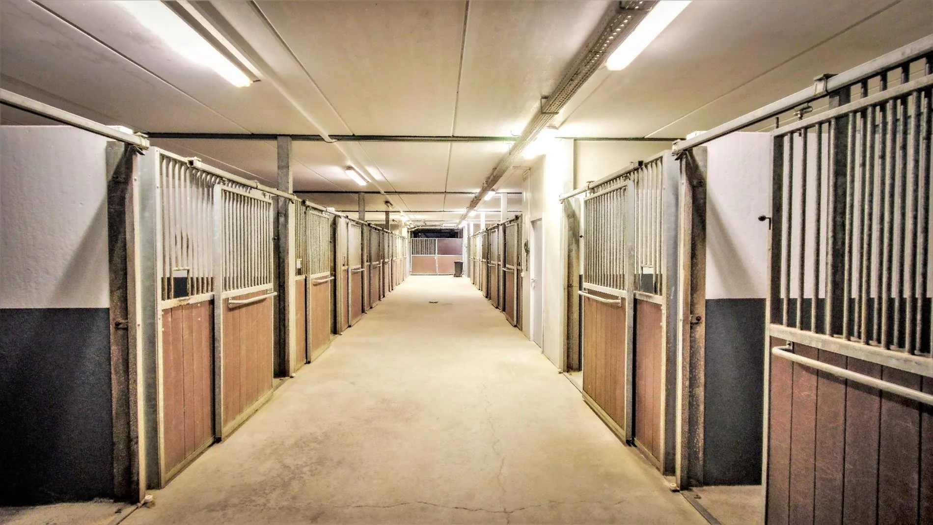 -145 stalls in 12 different compartments. Each corridor has its own wash stall or preparation area, solarium, tack room and telephone.
