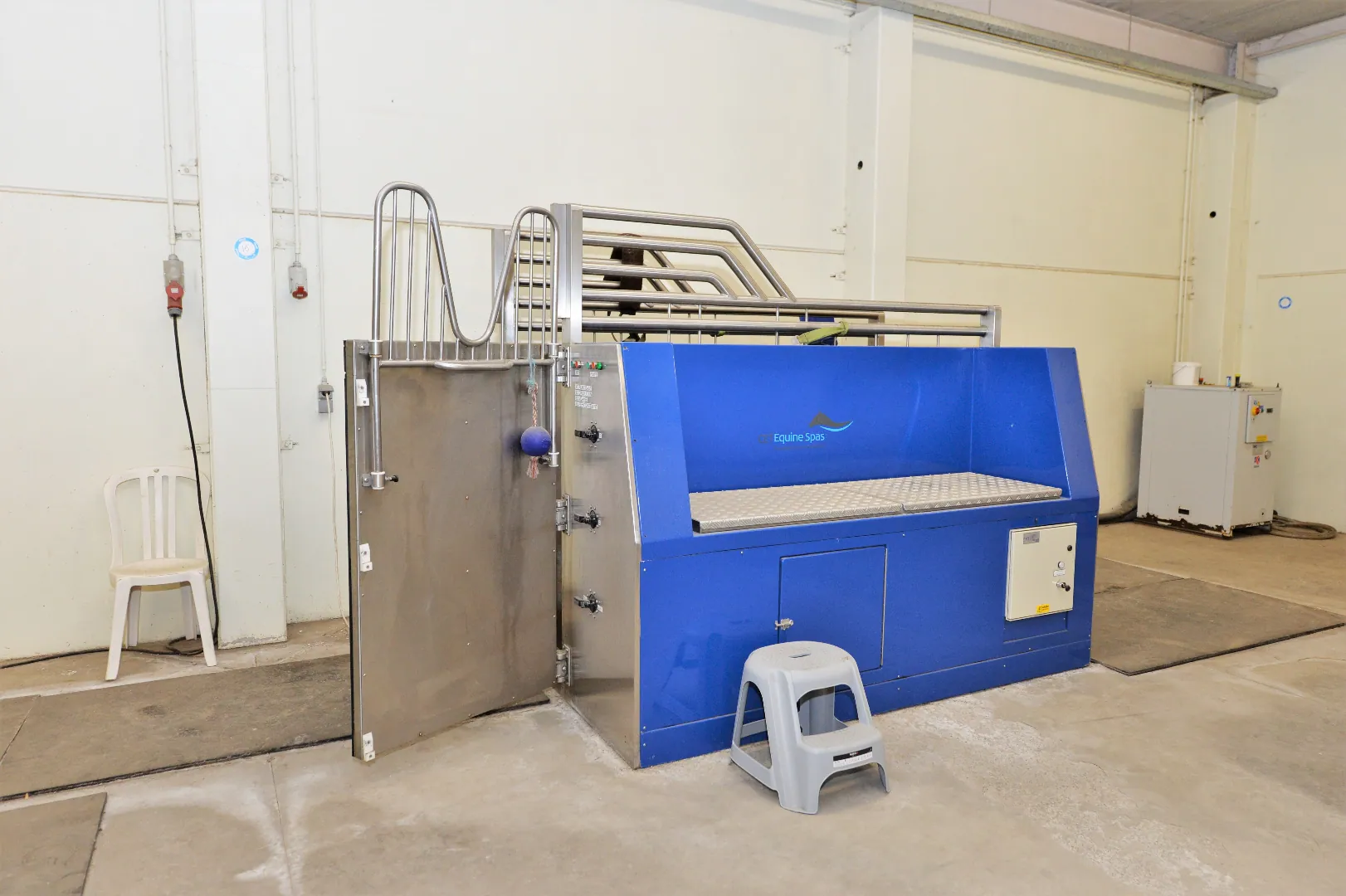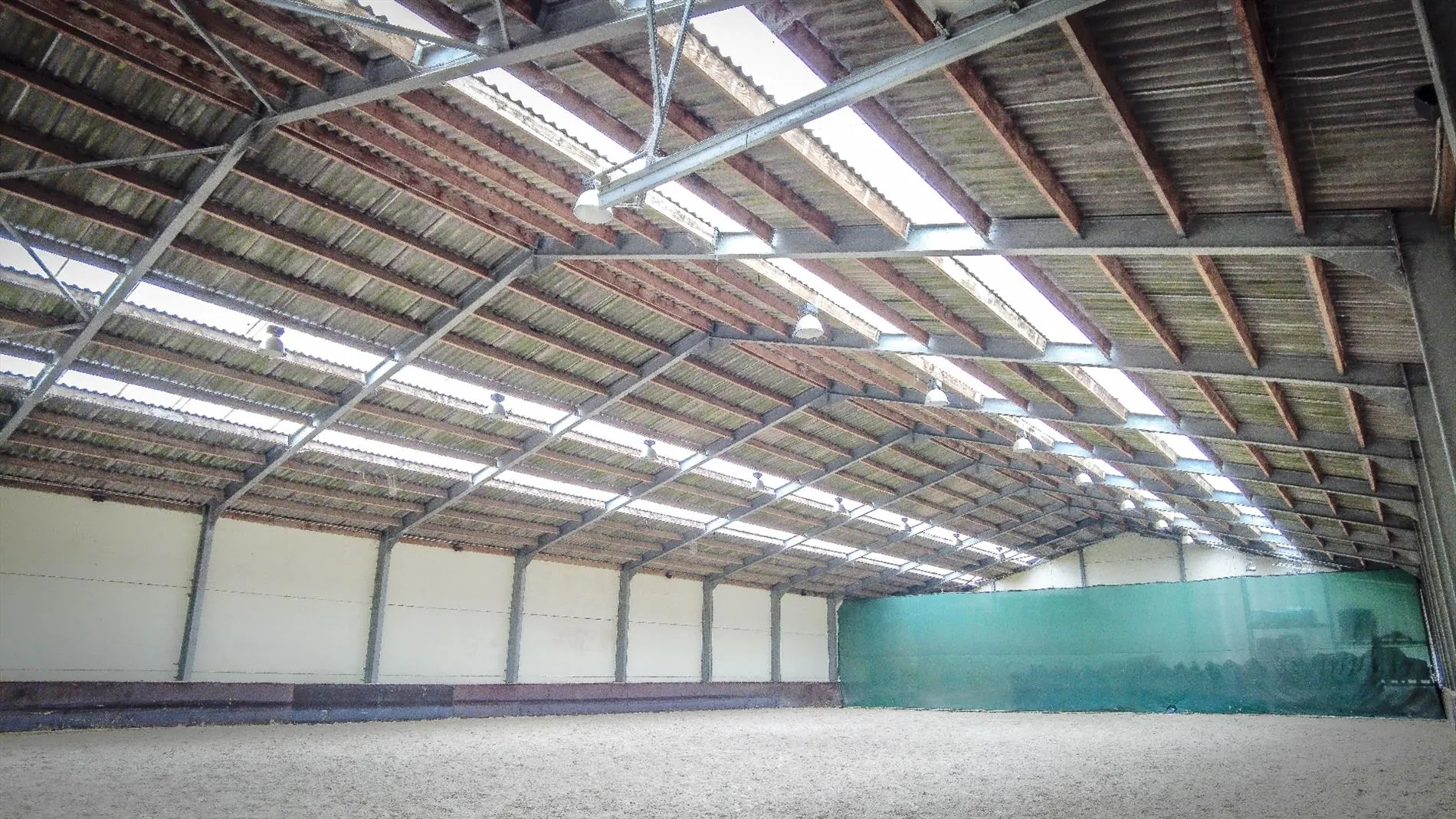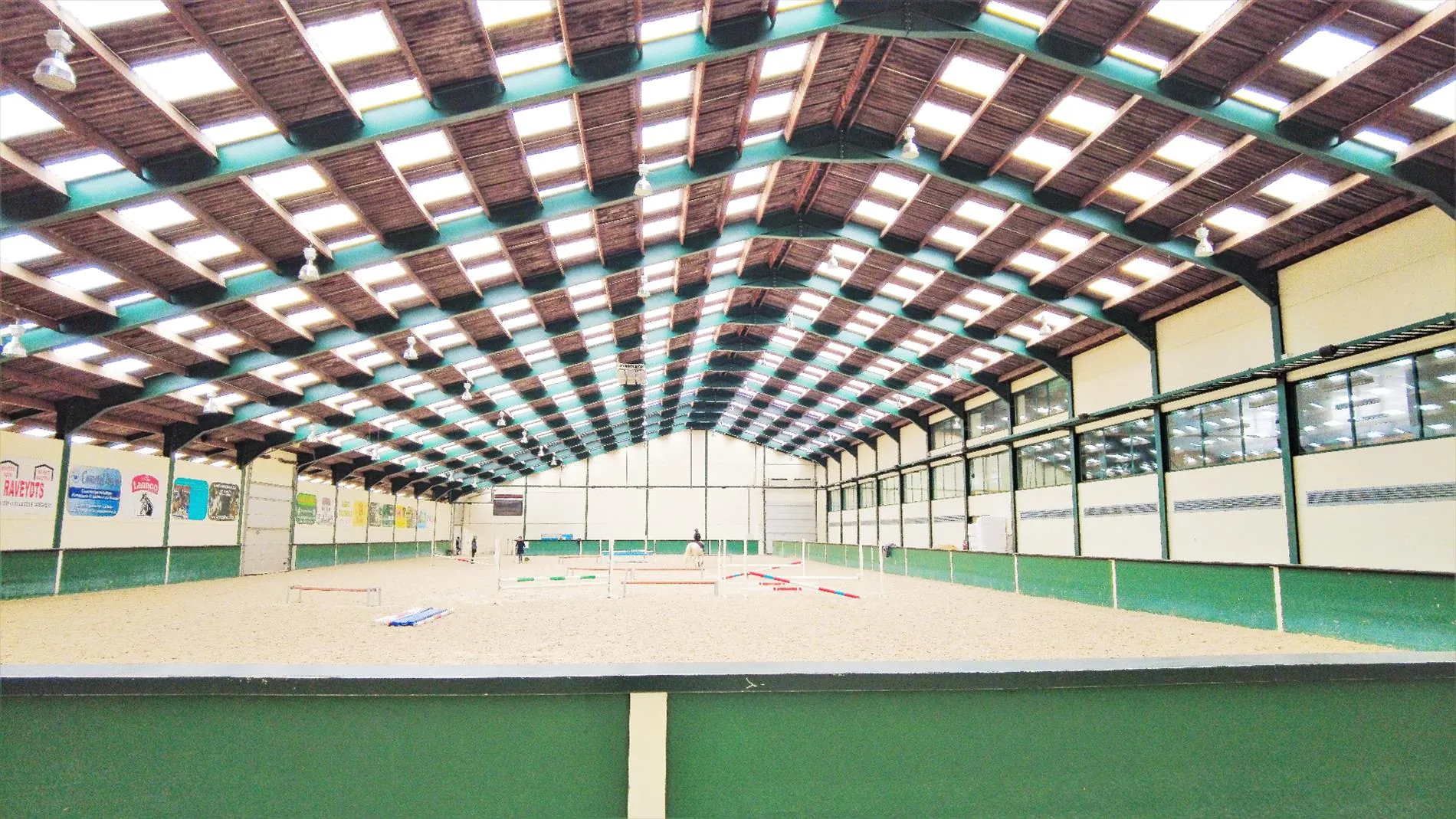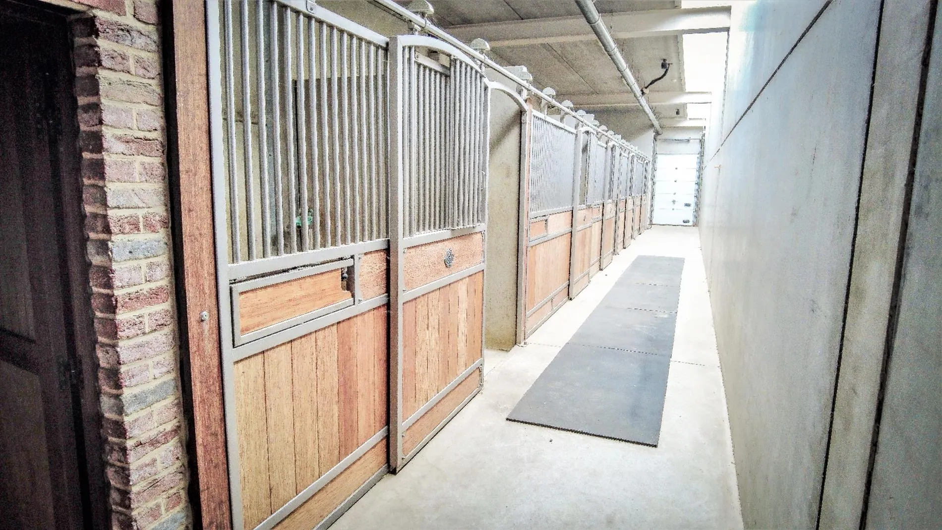 -145 stalls in 12 different compartments. Each corridor has its own wash stall or preparation area, solarium, tack room and telephone.