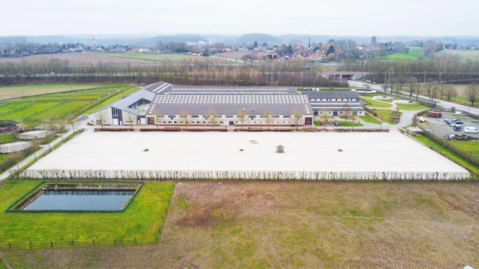 At Rebecq, in the heart of Europe, lies this unique and exclusive professional horse accommodation (constructed area more than 12.000m²) on approximately 16ha, well known as Haras de Wisbecq. The equestrian center is centrally located, near Belgium’s capital Brussels, between large cities as Charleroi, Ghent and Lille. The property is easily accessible via the highway E429/A8 (entrance and exit are only 100m away). Furthermore, the main airports, namely Brussels Airport and Charleroi airport, are nearby (approximately 30min). Finally, the complex is situated perfectly in order to leave for competitions in Belgium (for instance Azelhof and Sentower) or a foreign country (for instance Peelbergen and Tops International Arena at Valkenswaard).