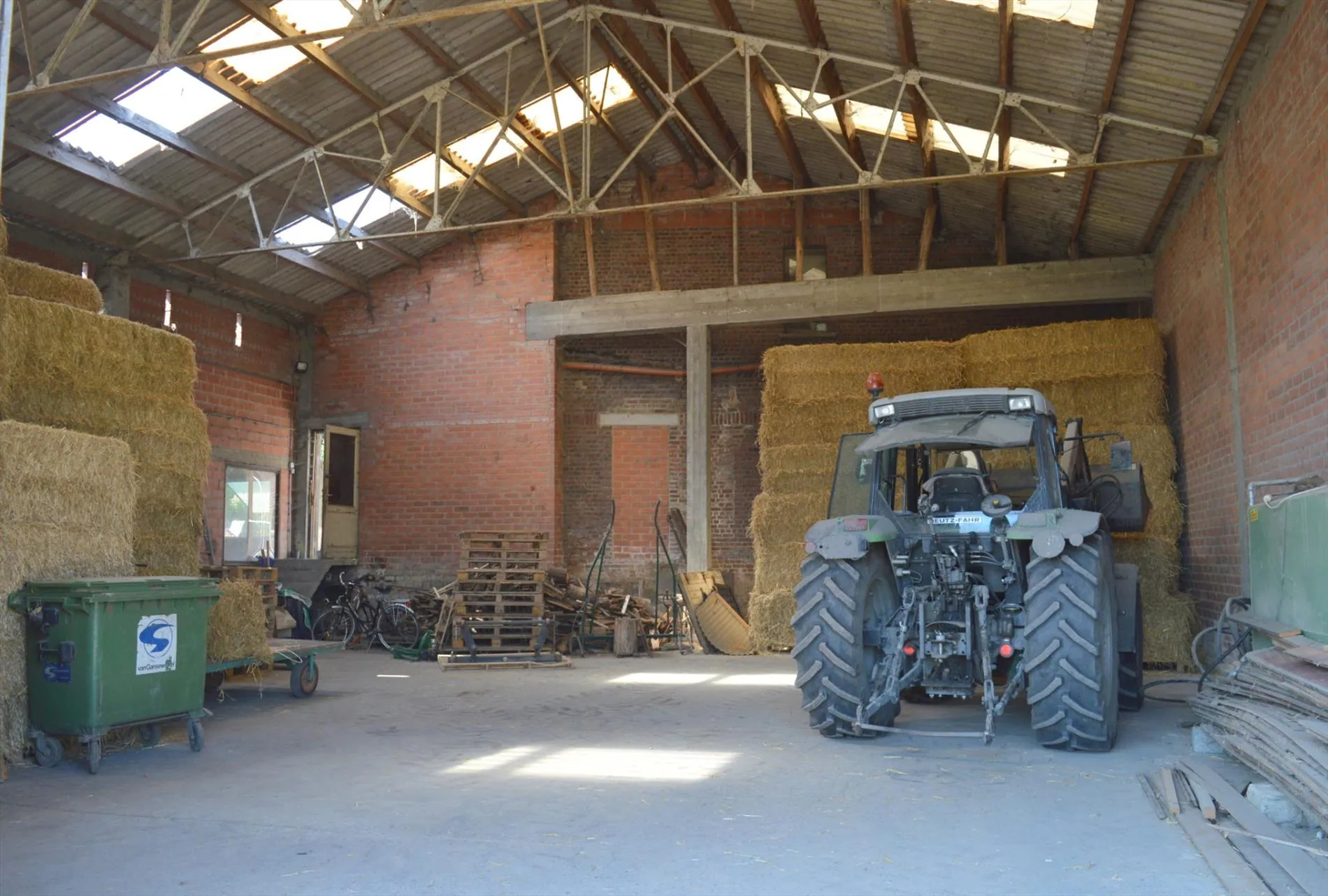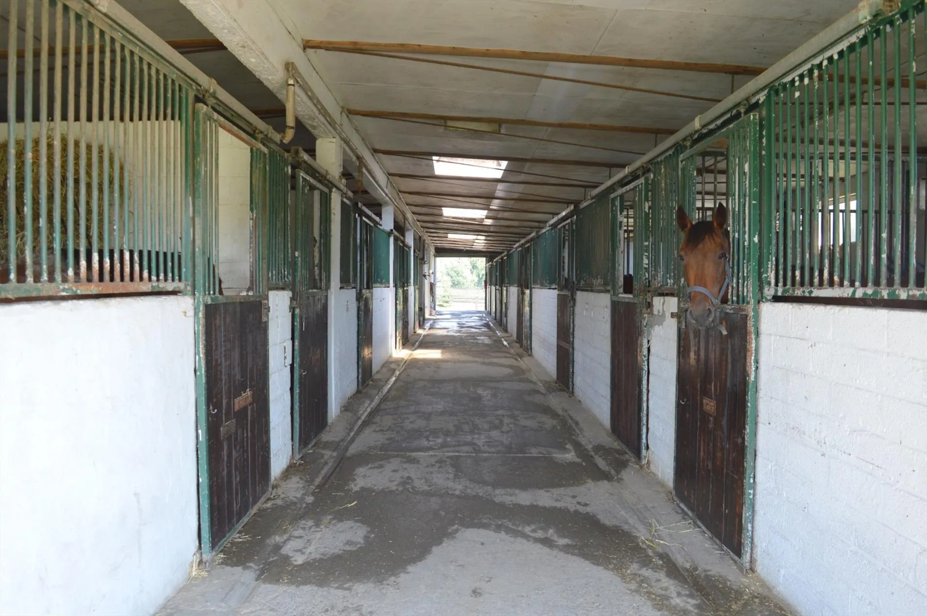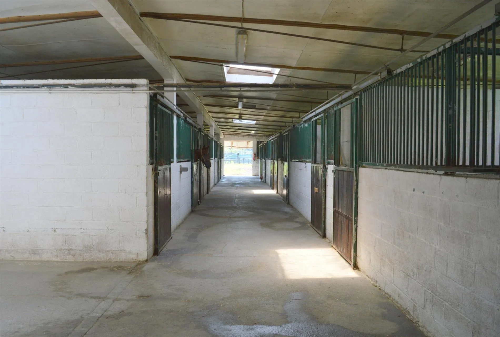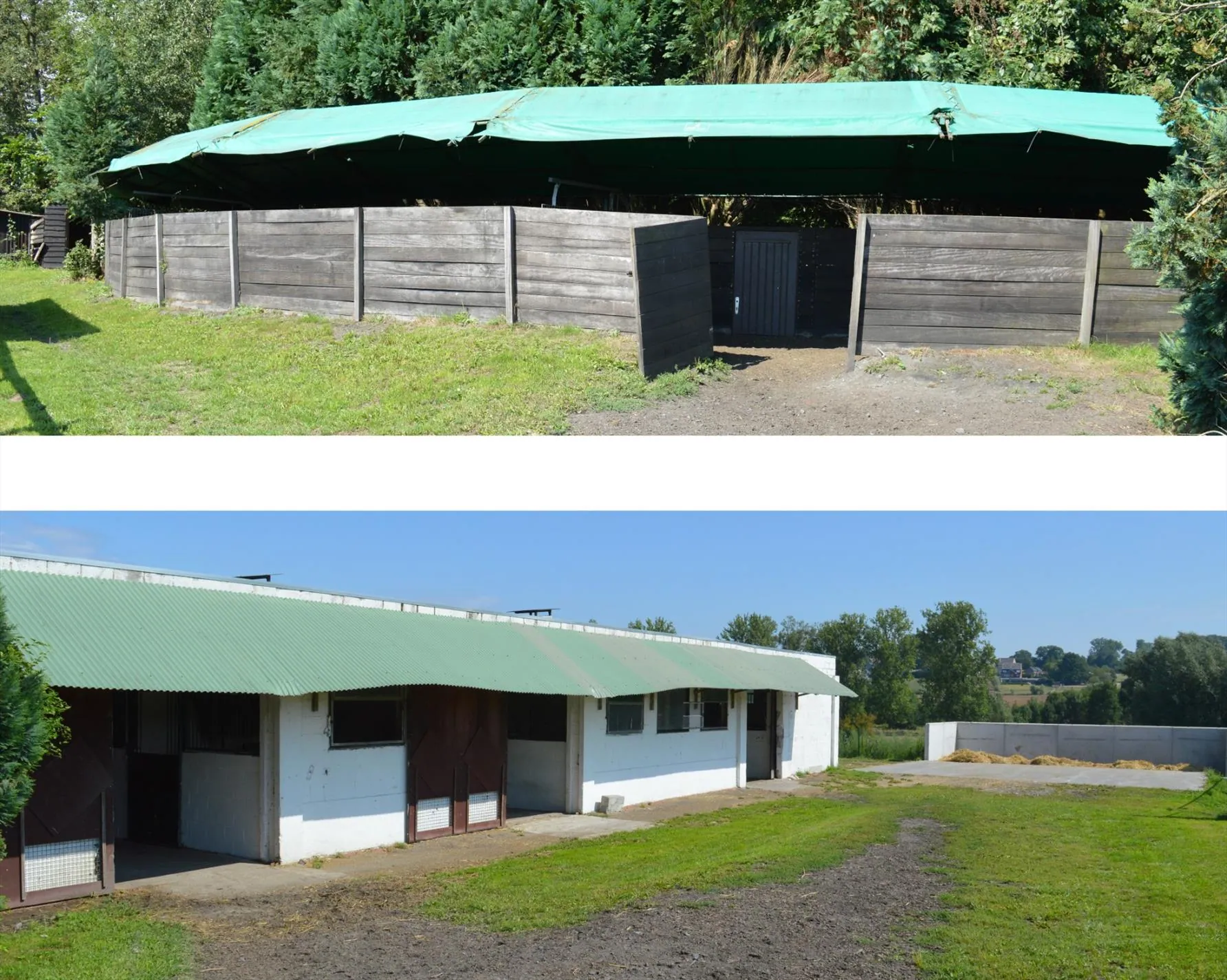 Centraal tussen Geraardsbergen, Zottegem en Oudenaarde en vlakbij de N8, bevindt zich deze idyllisch gelegen eigendom. Het domein bevindt zich langs een kleine weg in het mooie landschap en paalt aan een ruiterroute. Het geheel bestaat uit een woning en een appartement, een grote opslagloods, een stalgebouw met 40 boxen, 2 stapmolens, een professionele drafbaan en voldoende weide. De woning heeft volgende indeling: inkomhal met toilet, woonkamer met zit- en eethoek, bureau, keuken en 2 kelders. Boven zijn er 3 grote slaapkamers en een badkamer. De zolder werd recent geïsoleerd. Het tweede gedeelte van het huis bestaat uit opslag- en bergruimte op het gelijkvloers en op de verdieping is er een zelfstandig appartement met woonkamer, keuken, badkamer, apart toilet en 2 slaapkamers. De opslagloods (15m*15m) heeft een praktische hoogte en dient als stro-, hooi- en materiaalberging. Het stalgebouw (30m*40m) beschikt over 40 ruime stallen van min. 3,5m*4m, automatische drinkbakken, eetbakken en voldoende licht en lucht. Er zijn verschillende solaria en wasplaatsen en voldoende opslagplaats. Achteraan het gebouw bevindt zich de stapmolen in water, een grote stapmolen voor 8 paarden, 5 aparte weidepaddocks en de mesthoop. De professionele drafbaan heeft een breedte van min. 8m en een lengte van ca. 650m. Aan de binnenkant van de drafbaan liggen de 11 veilig omheinde weidepaddocks waar 3 schuilstallen en watervoorziening zijn. Prachtige eigendom voor elke tak van de paardensport!