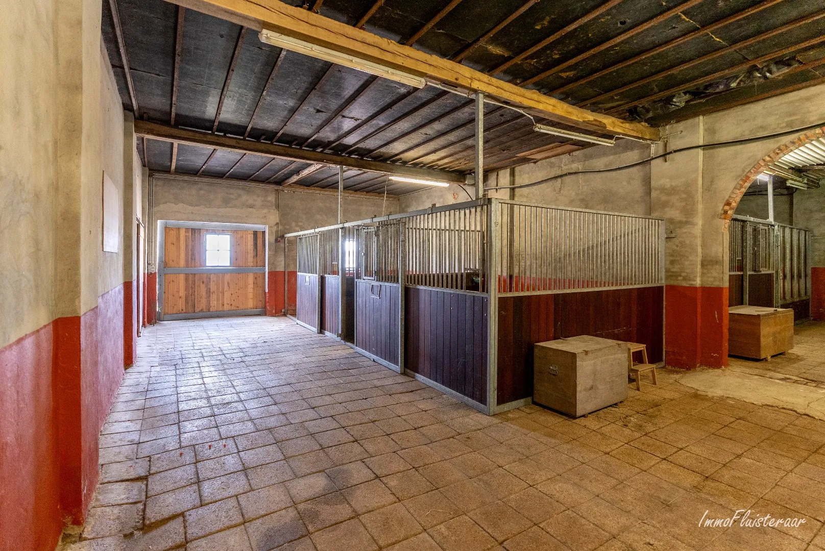 The property consists of a spacious country house with a stable building in the same architectural style. The stable building contains 7 spacious horse stalls, including 1 large rearing stable, a garage, and plenty of storage space. Behind the stable building, there is a generous storage area with room for large equipment, hay, and straw. There is also plenty of space to potentially add more horse stalls.