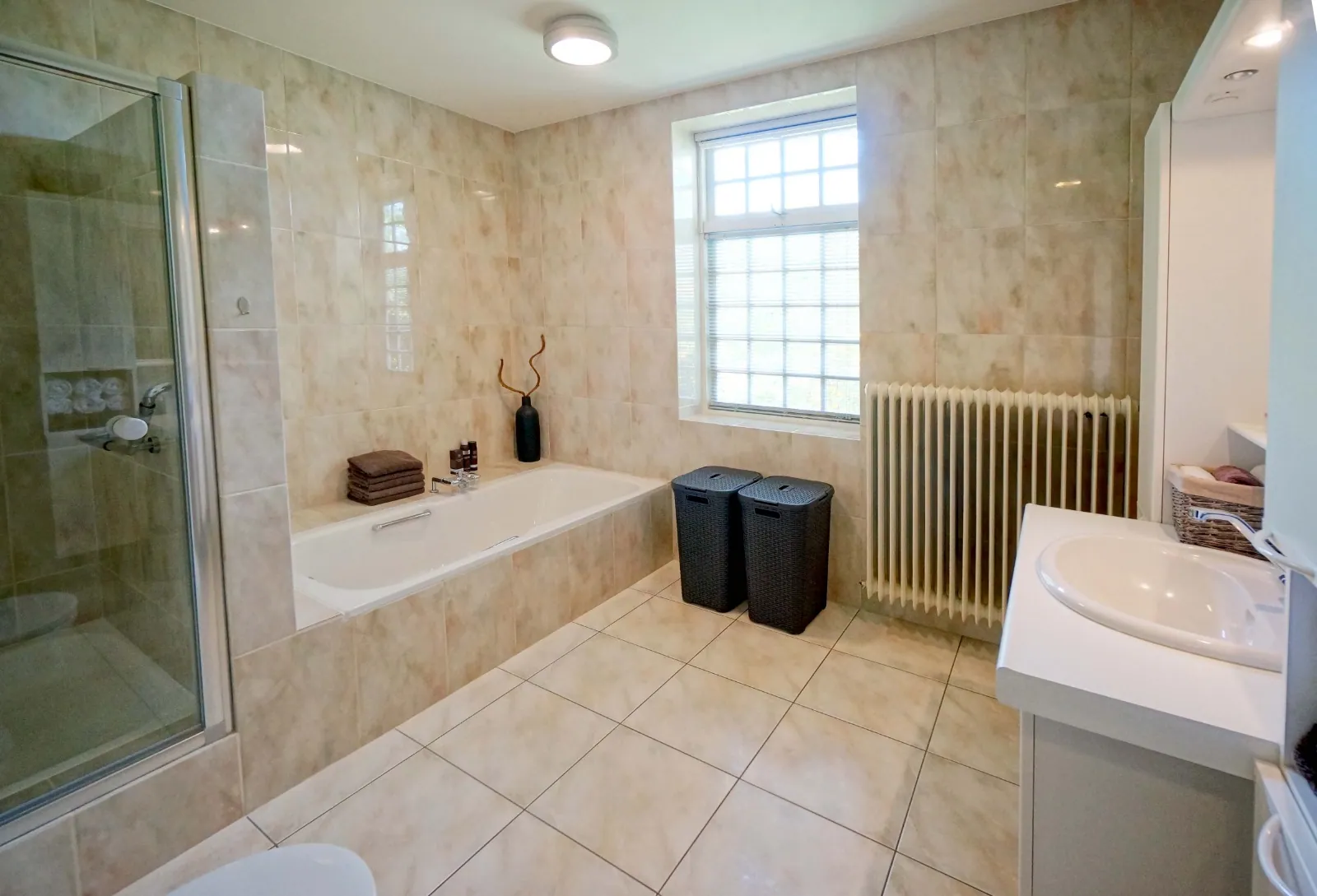 Boven zijn er nog 2 slaapkamers en een extra badkamer met lavabo, toilet en douche. Er is nog een grote multifunctionele ruimte (ca. 77m²) die naar eigen behoefte ingericht kan worden.