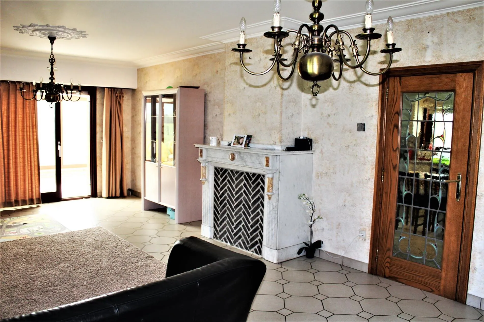 De woning (ca. 300m²) bestaat op het gelijkvloers uit een inkom- en trappenhal, een gastentoilet, een keuken met bijkeuken (ca. 15m²) en een ruime en zonnige living met open haard (ca. 35m²), die toegang biedt tot de veranda en de tuin. Verder bestaat het gelijkvloers uit 2 slaapkamers (ca. 12m² en 16m²), een bergkamer (ca. 10m²), een extra toilet en een badkamer met ligbad. De 1e verdieping dient nog afgewerkt te worden en kan ingevuld worden naar eigen smaak en wens. De 1e verdieping herbergt 3 kamers, een toekomstige aansluitende badkamer en een kleinere kamer of bergkamer. Ten slotte is de woning volledig onderkelderd.