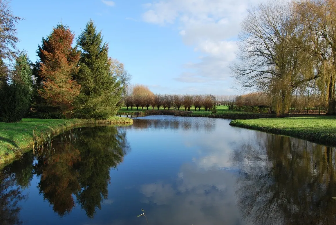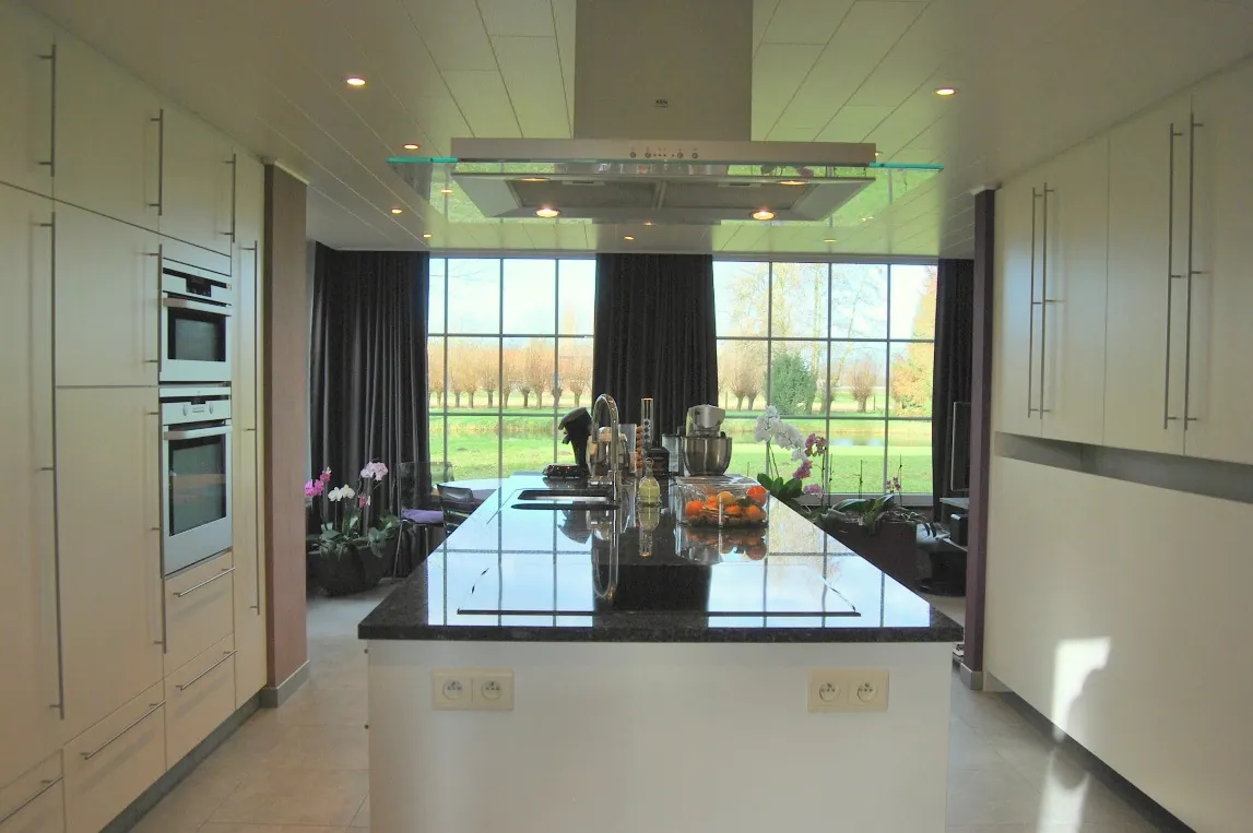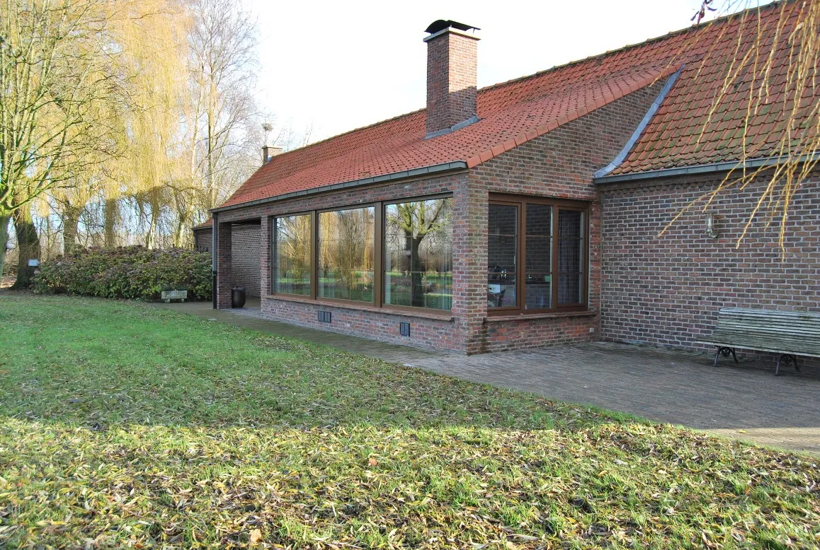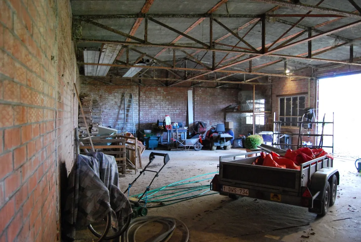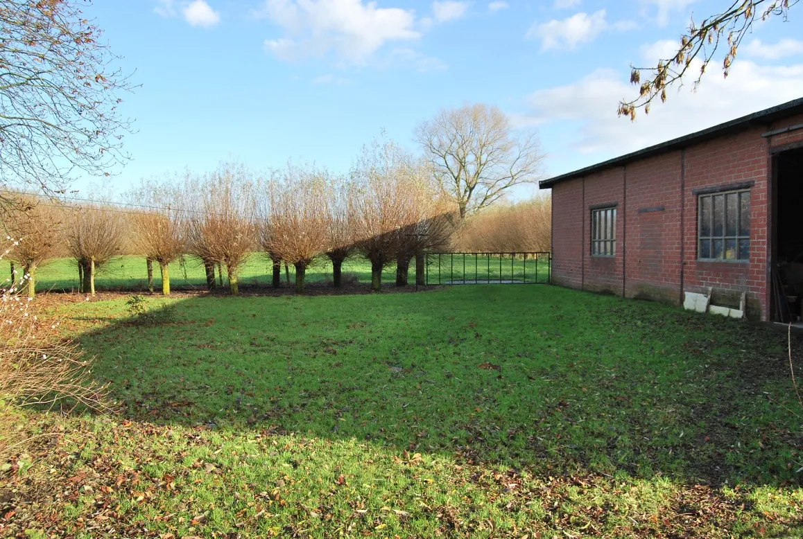 Deze eigendom is gelegen in een klein baantje, vlot bereikbaar via de E17. Het volledige domein is omheind met bomen en hagen. De toegang komt uit op een binnenplein waar de woning en het garagebouw staan. De hoeve werd grondig en structureel verbouwd in de jaren ’70 en in 2005 werd de volledige keuken en badkamer vernieuwd. De indeling van de hoeve is als volgt: ruime inkomhal met doorgang naar de woonkamer, grote leefkeuken met een prachtig uitzicht en een inbouwhaard, uitgeruste badkamer met douche, ligbad en dubbele lavabo, nachthal met apart toilet, bureel of slaapkamer en de tweede slaapkamer. Er is een schuurgedeelte in de woning dat momenteel ingericht is als garage met een wasplaats en praktische opbergplaats. De mogelijkheid bestaat om de woning uit te breiden naar een woonvolume van 1.000m³. Het garagegebouw bestaat uit een overdekte carport, een werkplaats en een hondenren. Aan de andere kant van het binnenplein is de toegang naar de tuin en naar de schuur (21m*9m). De schuur heeft 2 grote poorten en een ijzeren dakconstructie. Achteraan begint de prachtige grote weide, eveneens volledig omheind met knotwilgen. De andere kant van de woning ligt het tweede deel van de natuurlijke tuin met o.a. een mooie vijver die mee voor het idyllische uitzicht zorgt. De mooie oppervlakte van het geheel en de mogelijkheden met de gebouwen maken van deze eigendom een uniek gegeven!