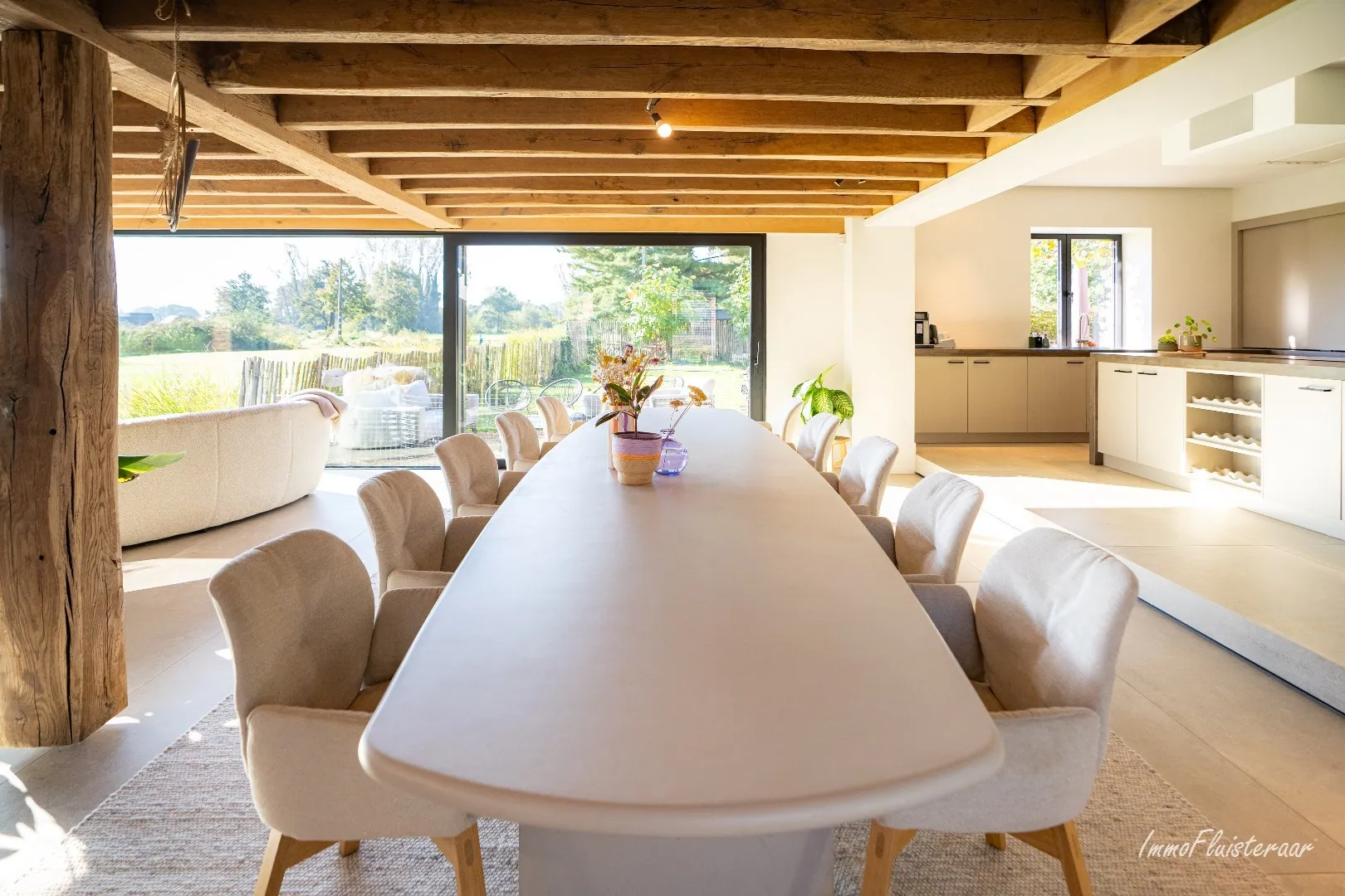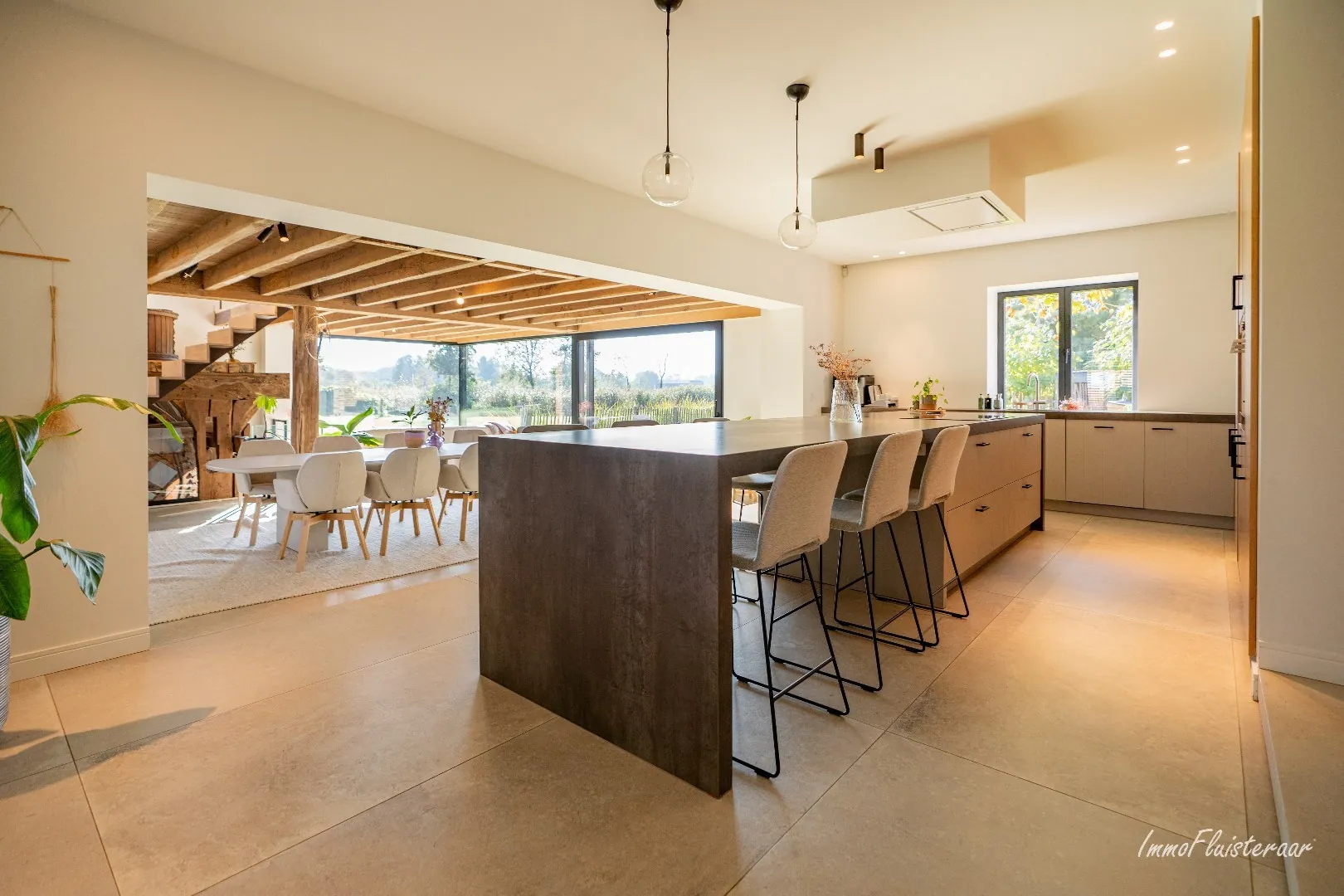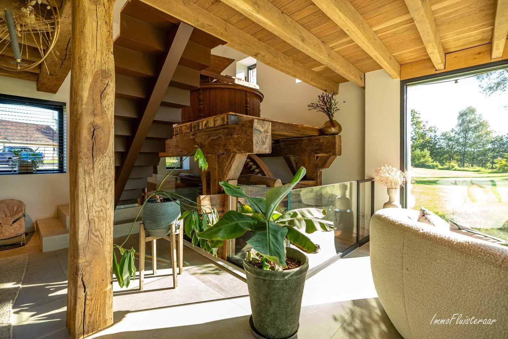 - Salle à manger spacieuse avec des poutres authentiques et un ancien moulin magnifiquement intégré dans le salon