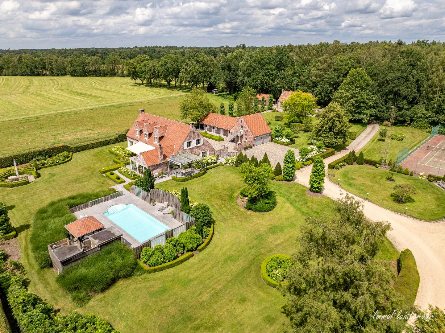 Il y a également un court de tennis, idéal pour jouer avec des amis et de la famille sans avoir à quitter la propriété. Envie de vous détendre après le sport ? Le jardin dispose également d'une piscine, l'endroit idéal pour le faire.