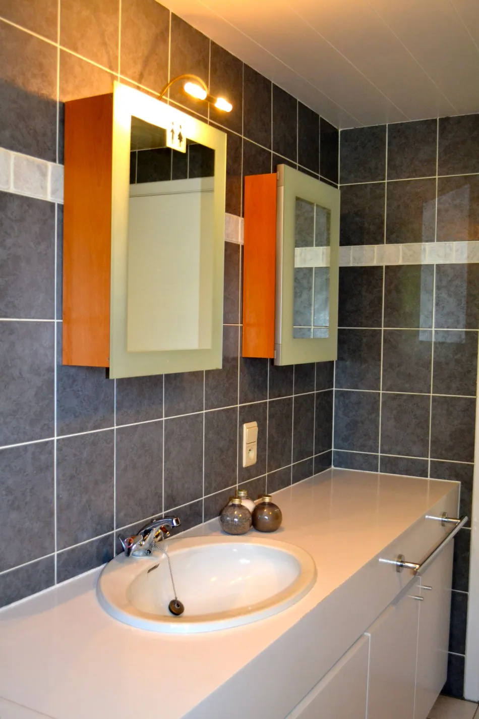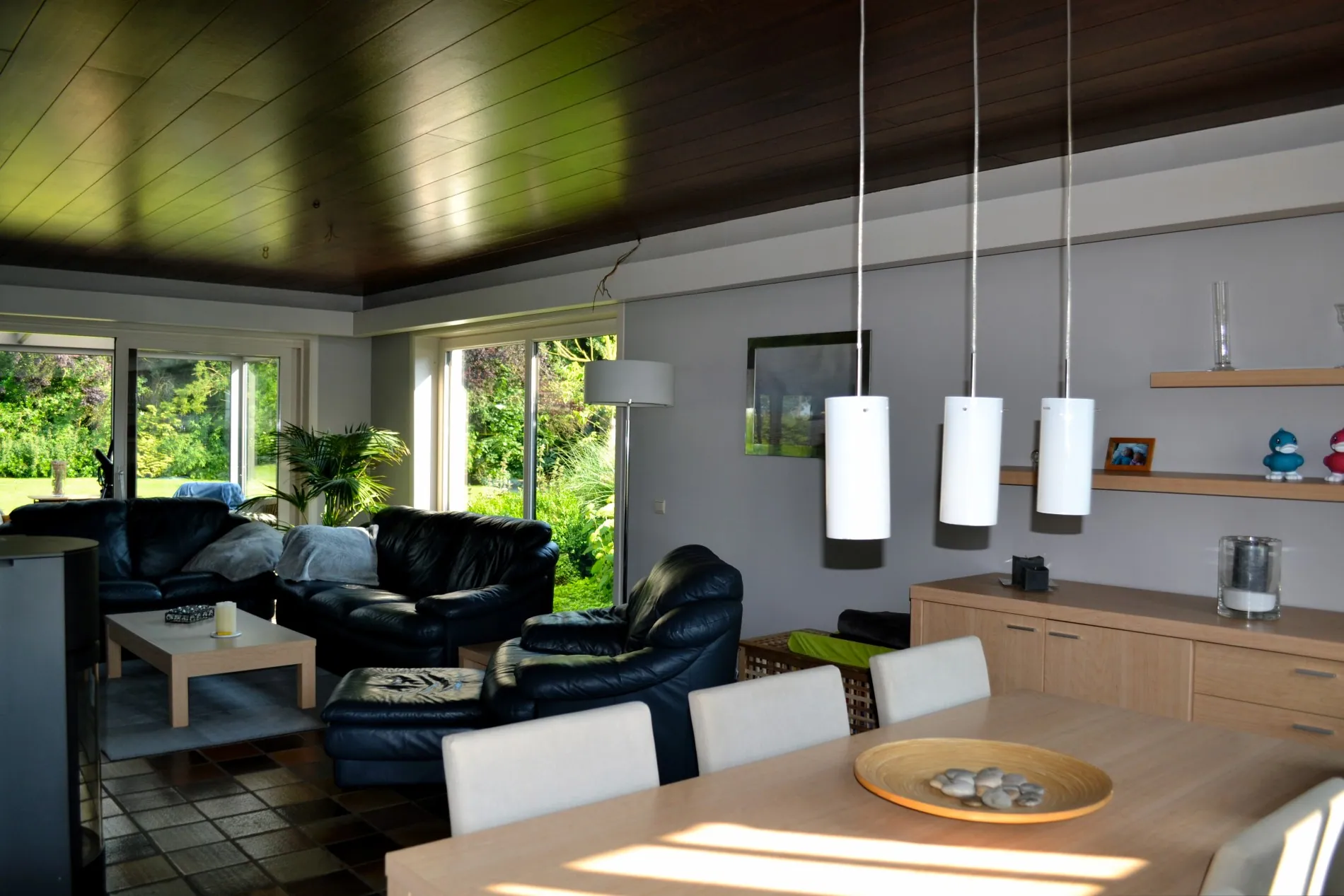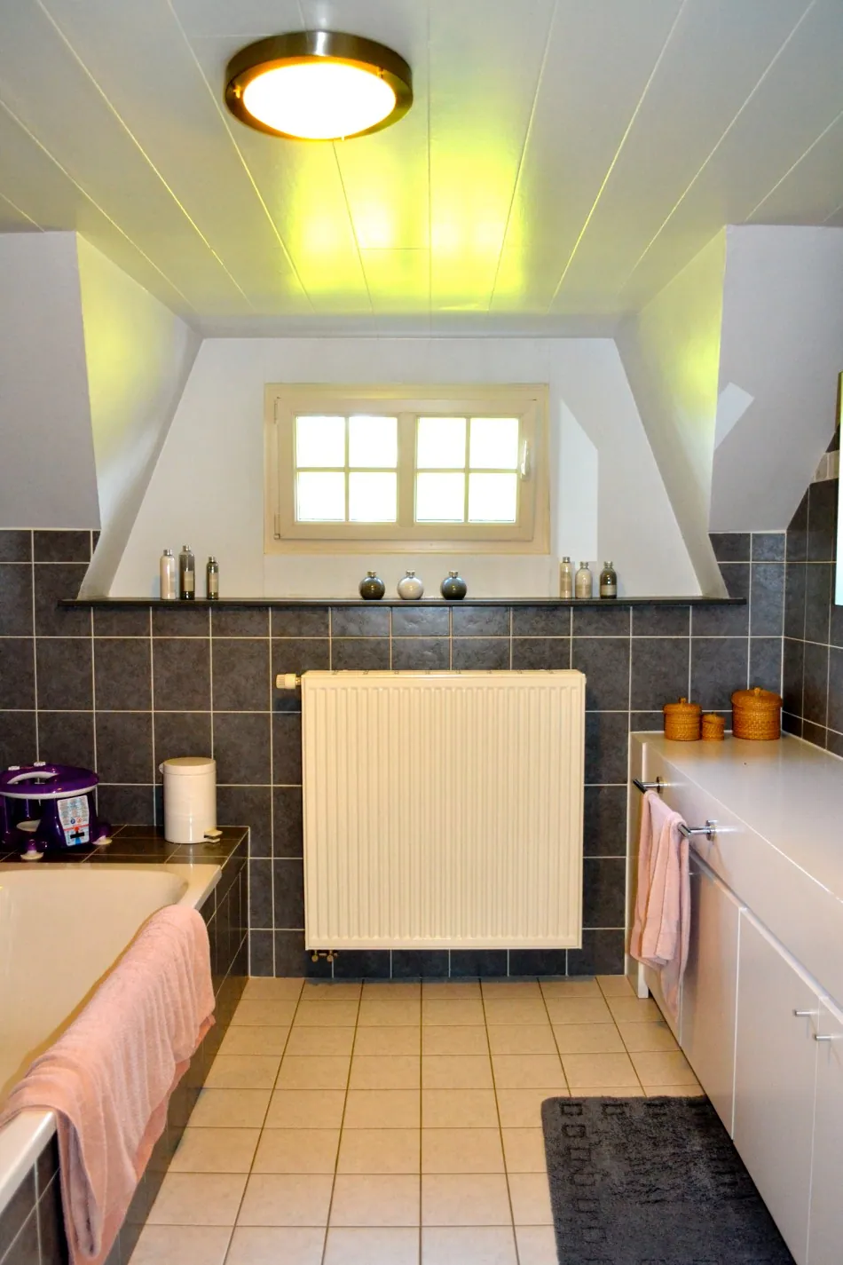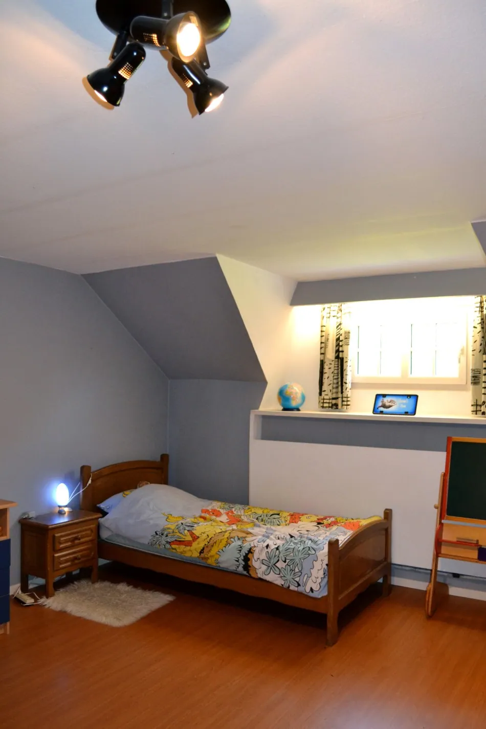 Op de eerste verdieping bevinden zich: 3 slaapkamers met de mogelijkheid om een 4de slaapkamer te realiseren (momenteel TV-ruimte/speelkamer), een gastentoilet en een badkamer met ligbad, douche en lavabo en een ruime zolder.