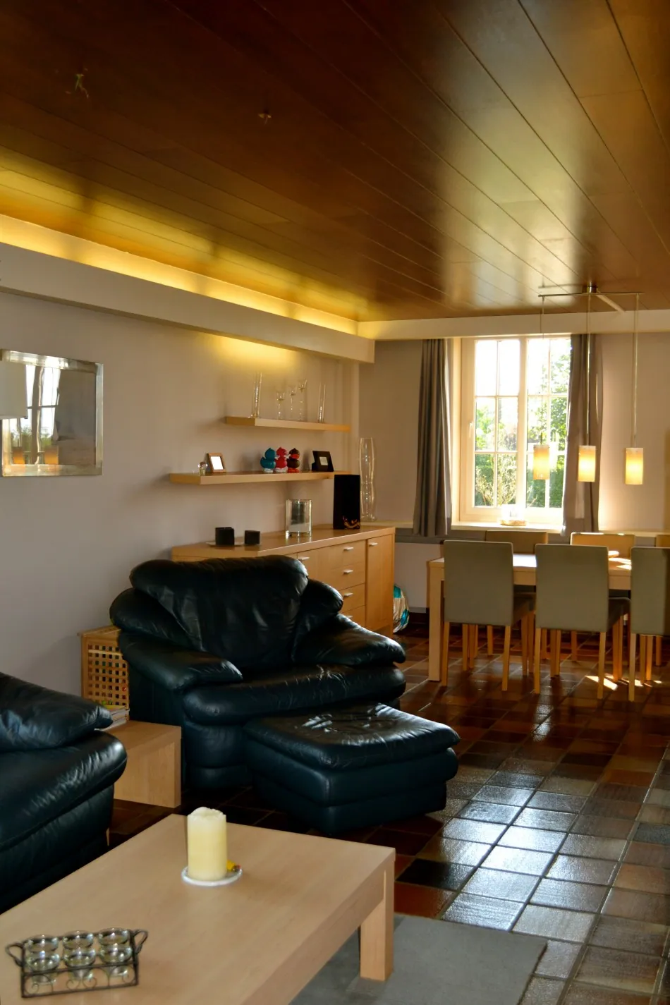 De indeling is als volgt; een centrale inkomhal met gastentoilet, vestiaire en trap, een open volledig geëquipeerde leefkeuken, een overdekte ruime en zeer lichte veranda, een woonkamer met bureauhoek, een eetkamer, een slaapkamer en badkamer met douche en lavabo.