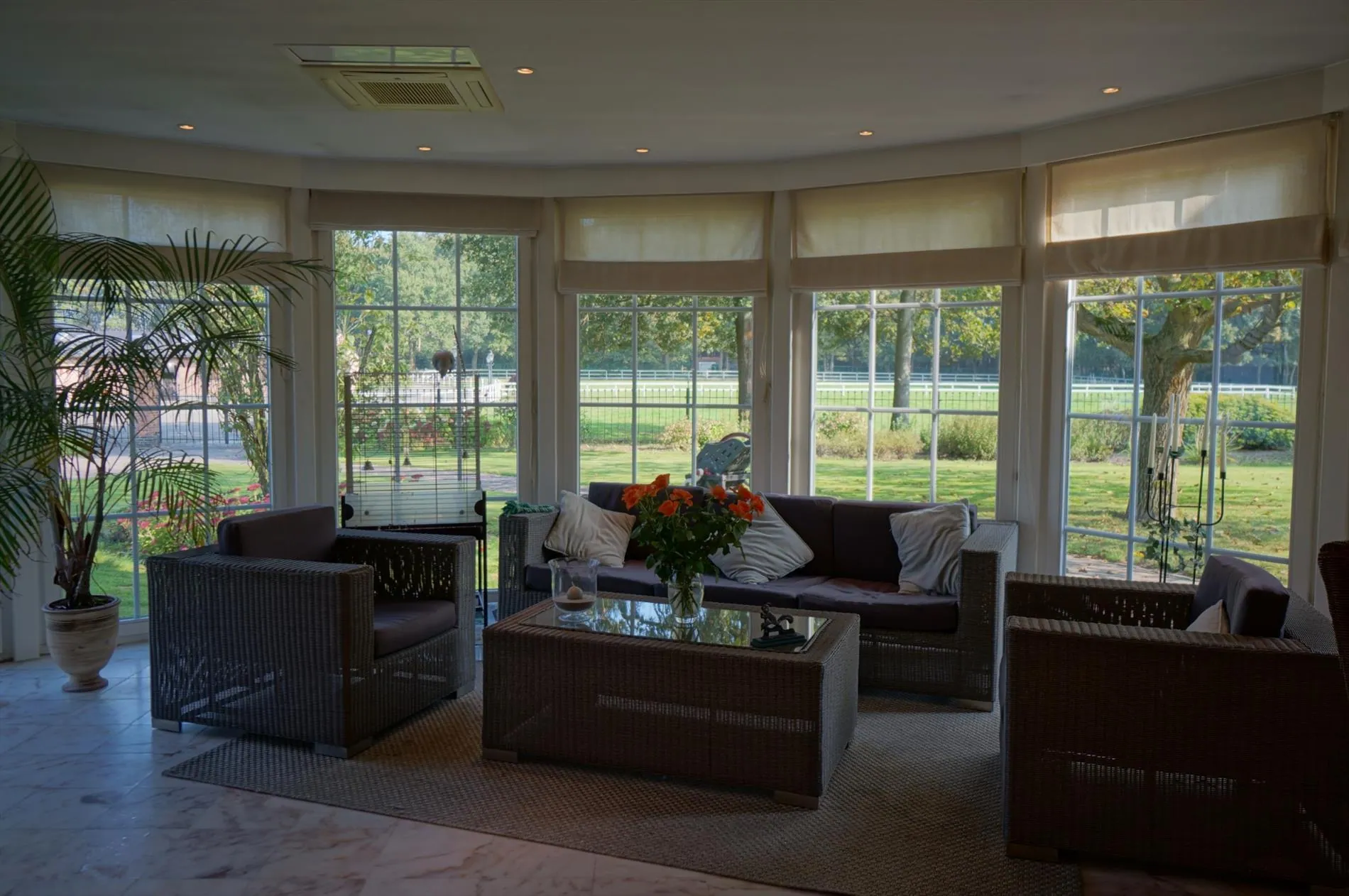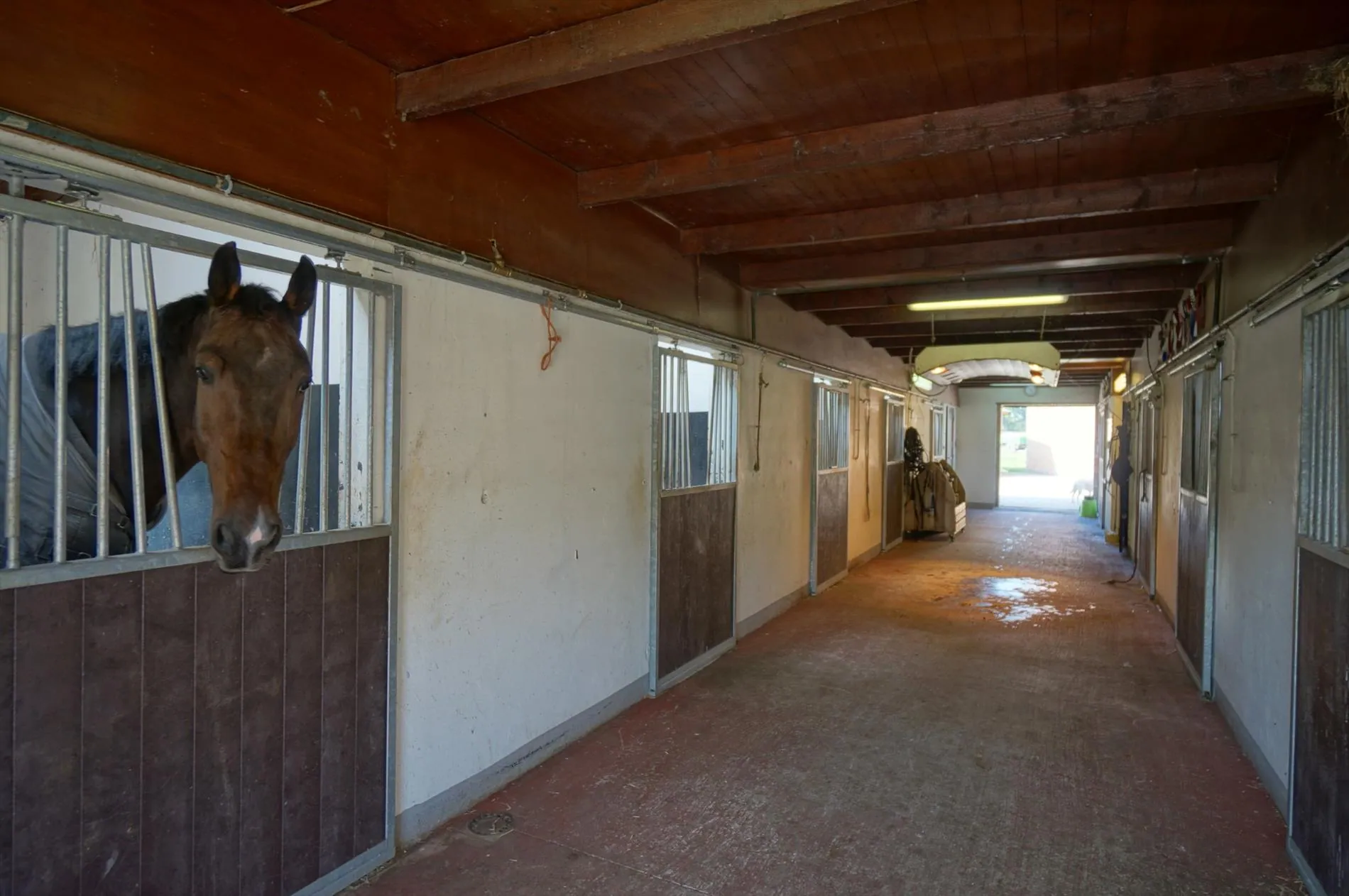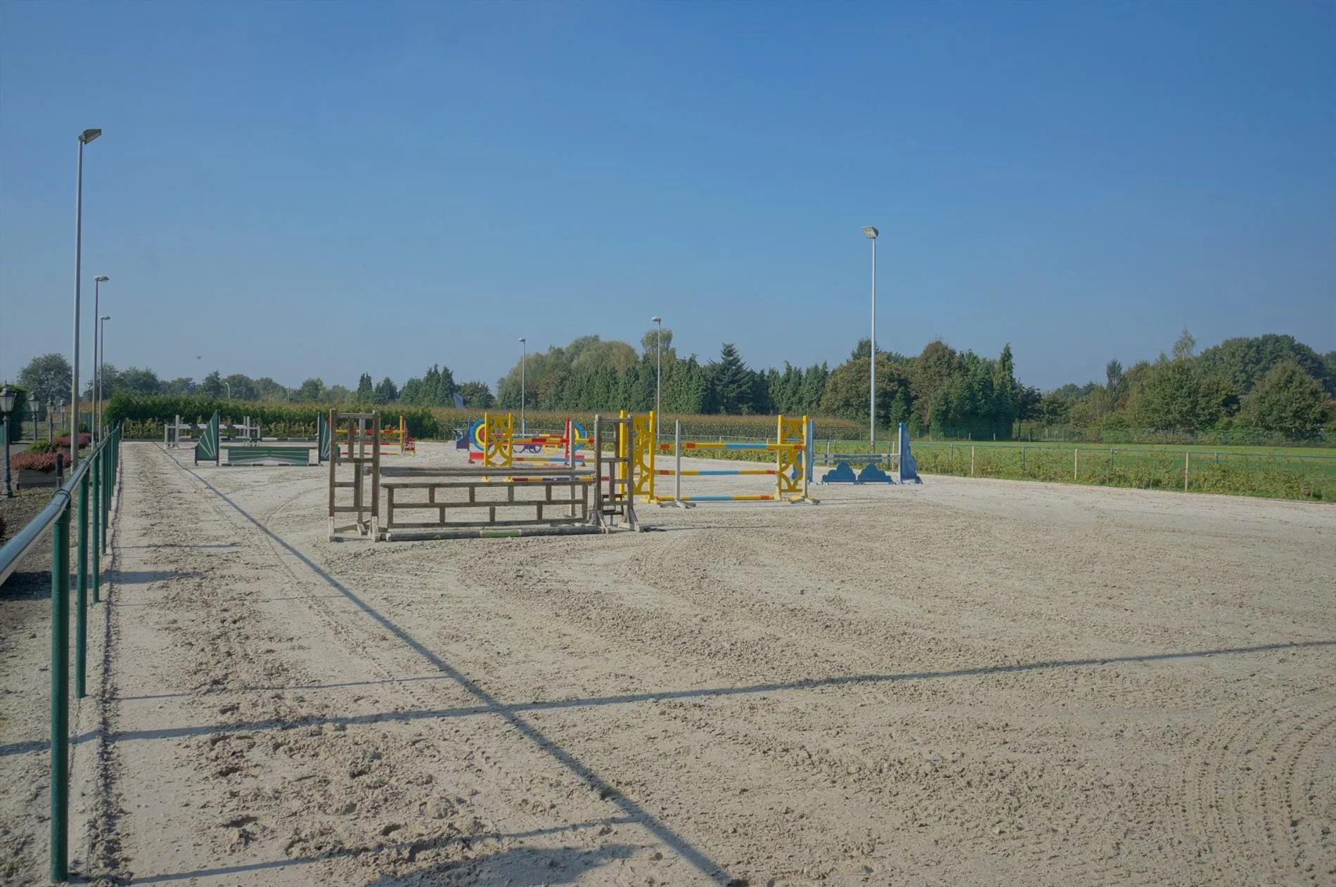Het geheel bestaat uit een luxueus landhuis met zwembad, binnenpiste (ca. 20m x 40m), 26 stallen, buitenpiste (ca. 30m x 60m), overdekte stapmolen, 5 garages, afdak voor de vrachtwagen, ….