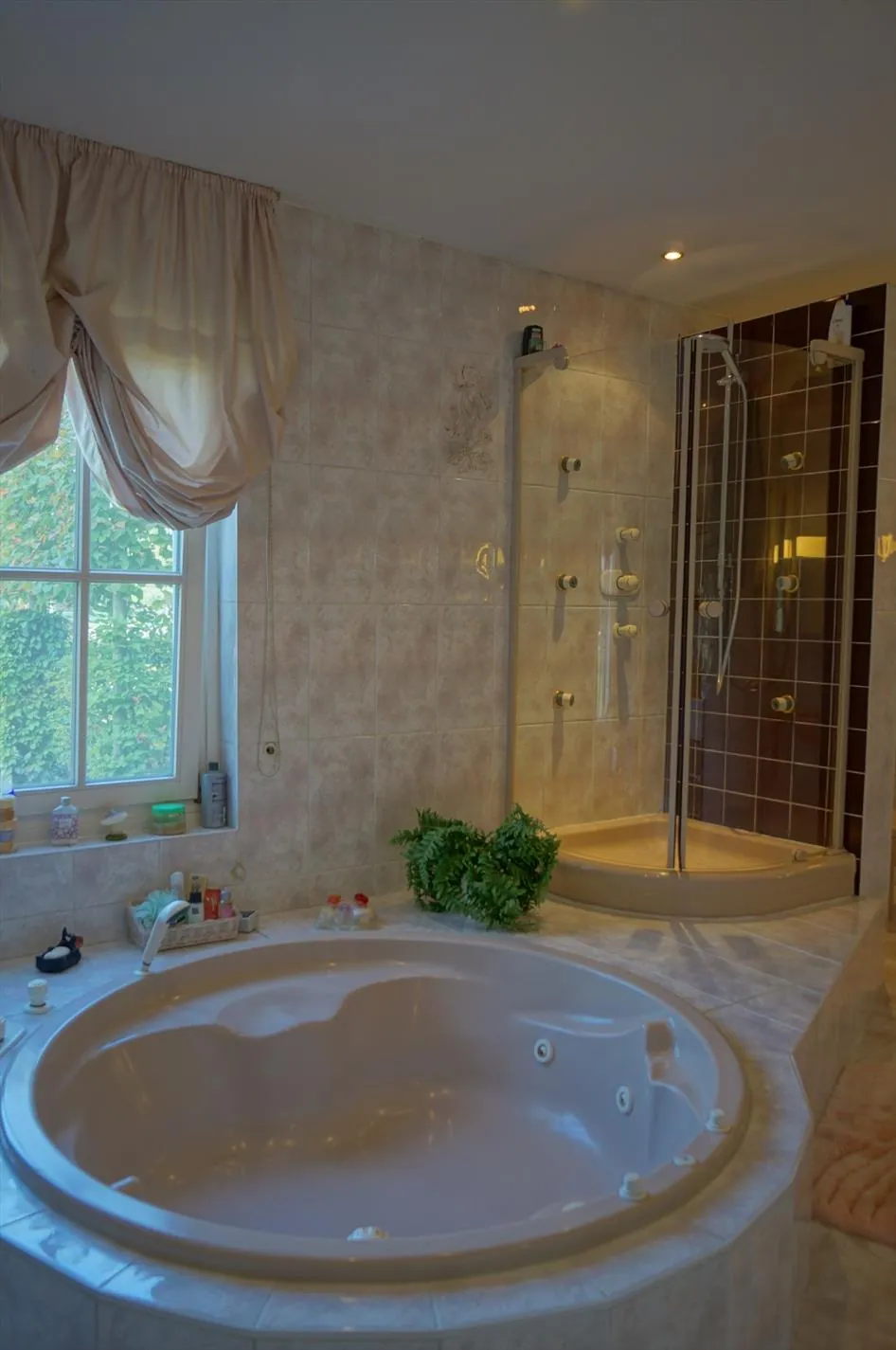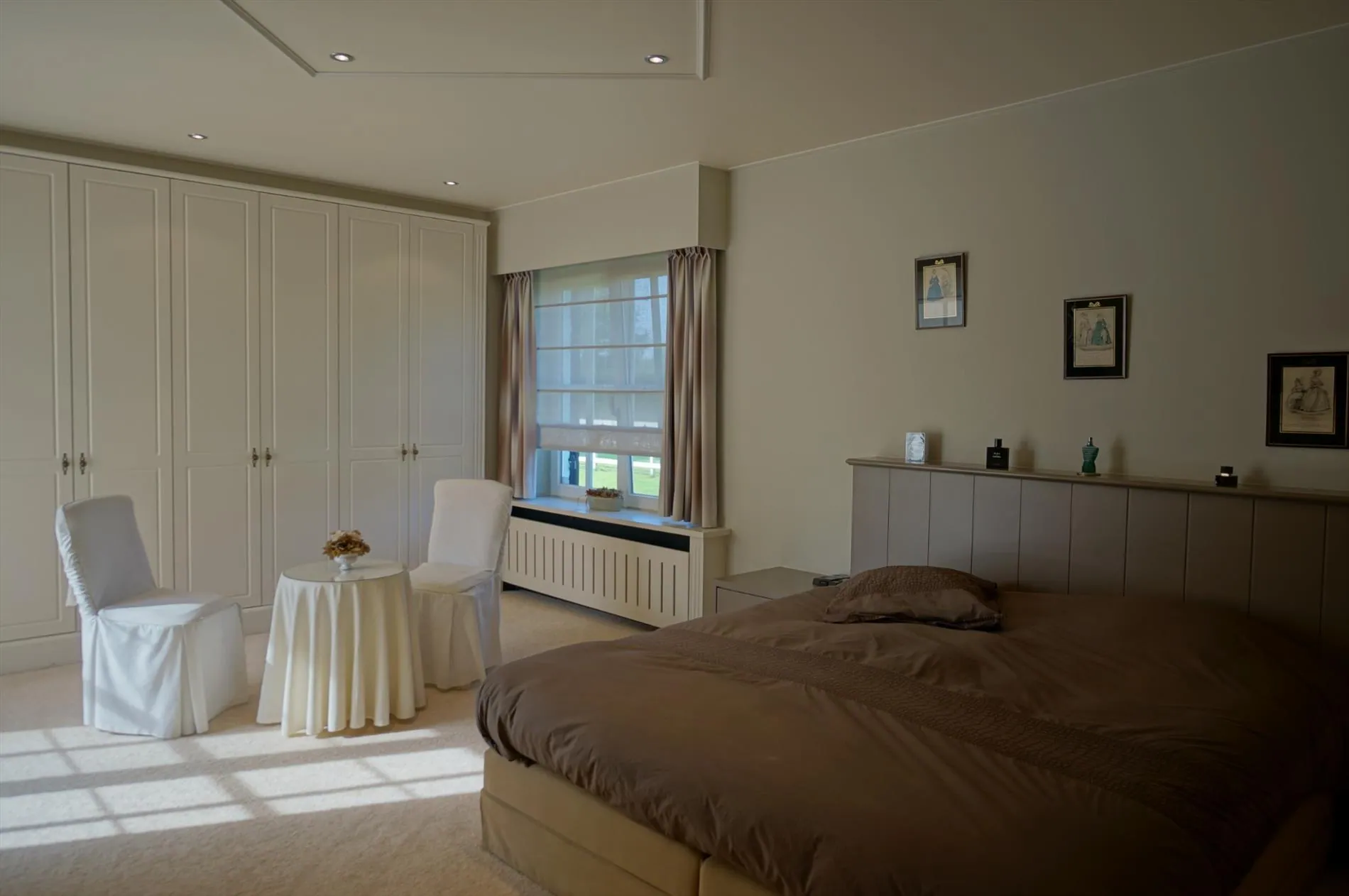 Verder is er op het gelijkvloers een masterbedroom met inbouwkasten en een grote badkamer met luxueus ligbad, douche, dubbele lavabo en toilet.