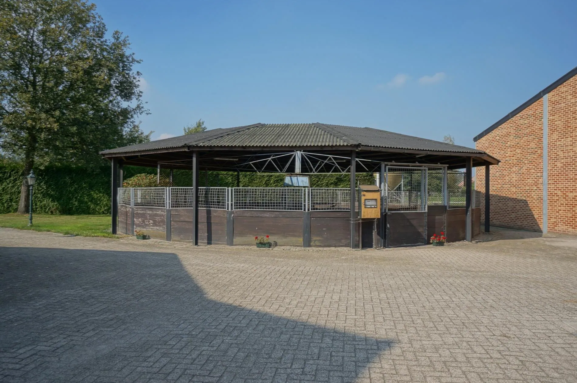 Tevens staat er een bijgebouw waarin men 4 ruime garages (met automatische poorten) en 1 garage voor de vrachtwagen kan terugvinden. Verder is er in dit bijgebouw nog een merrie-veulenstal en een ontvangstruimte met bar en sanitair.